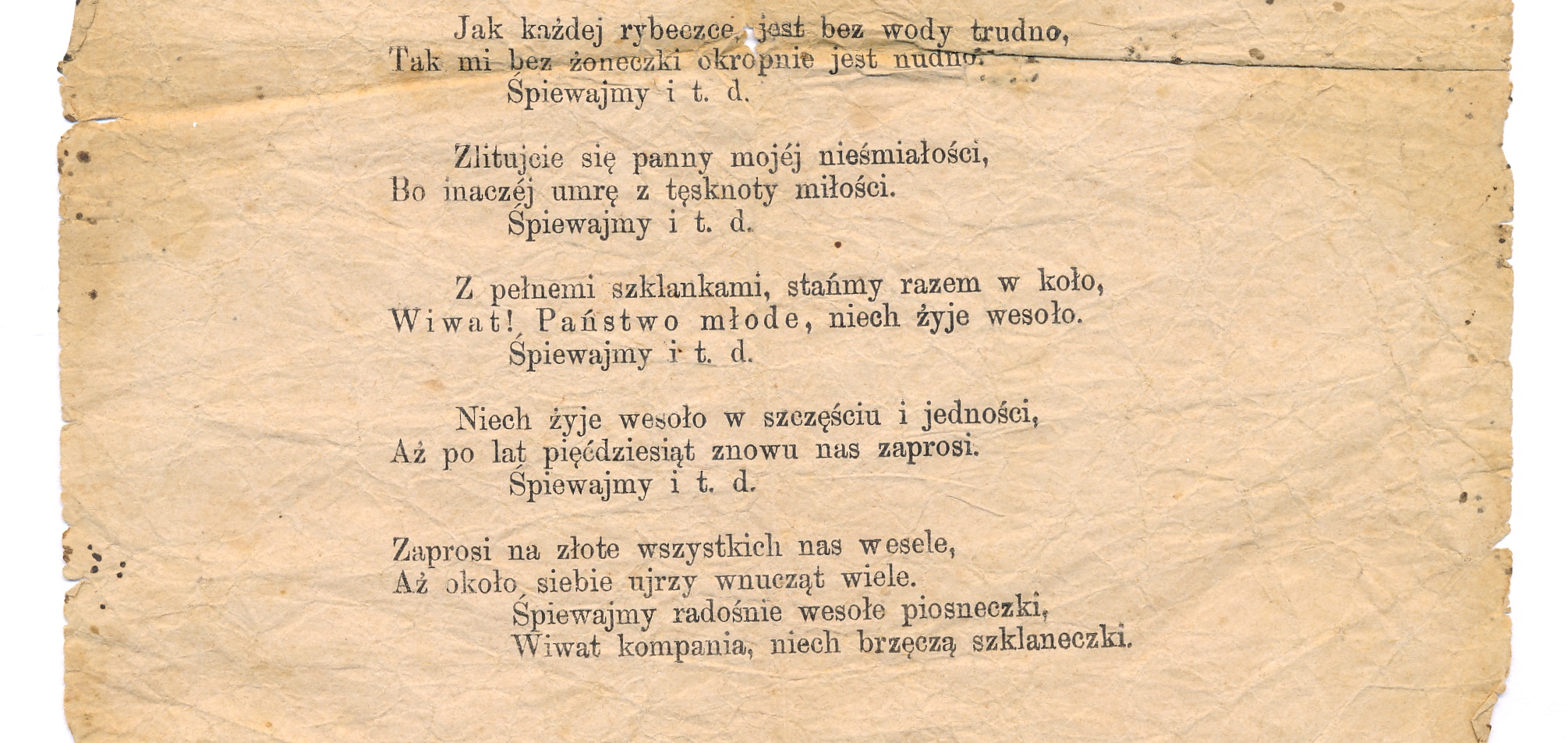 Na pożółkłej, wiotkiej kartce wydrukowano kilkadziesiąt wersów przyśpiewek weselnych wraz z refrenem w rytm krakowiaka, który był w XIX wieku najpopularniejszym tańcem ludowym w Małopolsce towarzyszącym weselom.