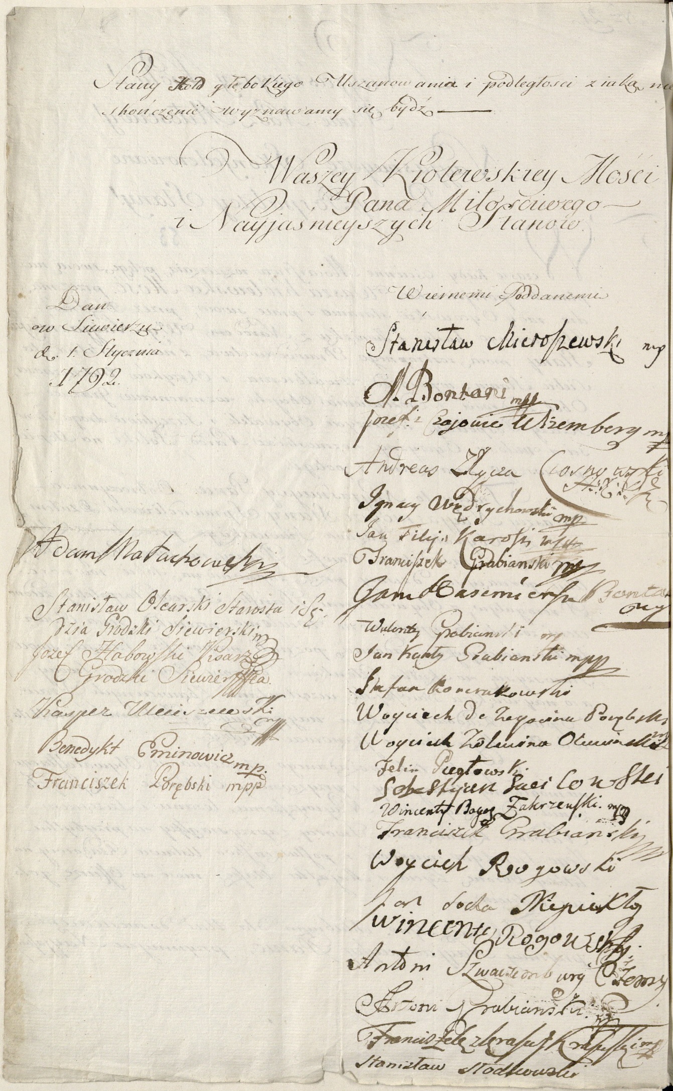 List szlachty siewierskiej do króla Stanisława Augusta Poniatowskiego z deklaracją poparcia dla Konstytucji 3 Maja, 01.01.1792 r. Zbiory Biblioteki Uniwersytetu Warszawskiego w Warszawie.