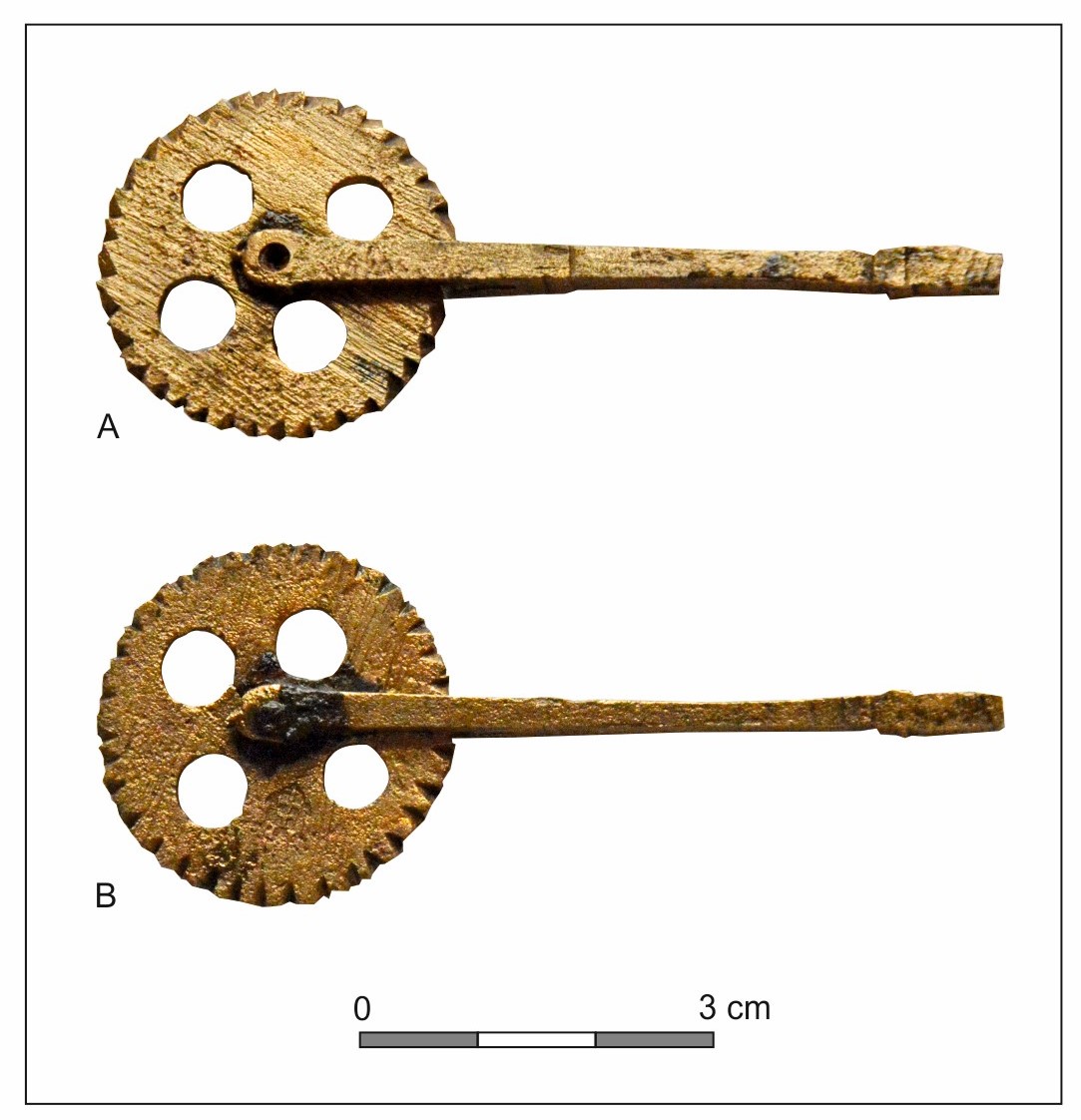 Egzemplarz przechowywany w zbiorach Muzeum Zagłębia w Będzinie pochodzi z badań archeologicznych, które przeprowadzono wiosną 2009 roku na siewierskim rynku, w obrębie ratusza (Ginter 2012) (ryc. 3). Artefakt został wykonany z mosiądzu, jego długość całkowita wynosi 7,7 cm, a średnica tarczki 3 cm. Na obwodzie części pracującej znajduje się ornament linii łamanej, którą odciskano na okładzinie książki (Ginter 2012). Na powierzchni tarczki można dostrzec cztery otwory oraz gmerk z dwoma krzyżami. Analogiczne radełko odnaleziono podczas badań archeologicznych w klasztorze oo. Paulinów na Skałce oraz w centrum Kutna (Ginter, Majorek 2021). Chronologia znaleziska przypada na XVI wiek, czyli na czas lokacji miasta Siewierz przez biskupa Jana Konarskiego.