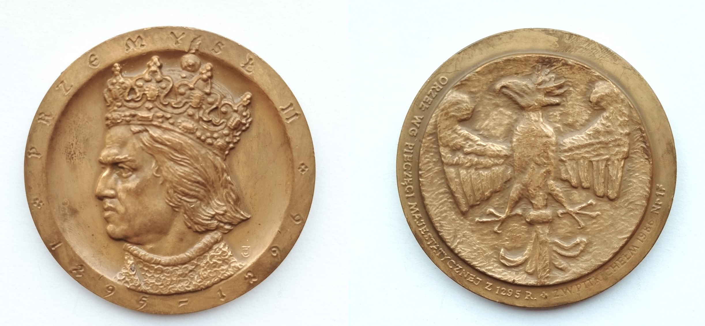 Ilustracja: awers i rewers medalu z wizerunkiem Przemysła II, ZW PTTK Chełm, 1987 r. Zbiory Muzeum Zagłębia w Będzinie.