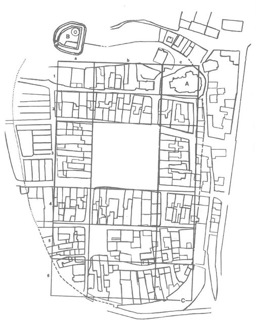 Ilustracja: Rekonstrukcja lokacyjnego rozplanowania Będzina, „Będzin 1358-2008” pod red. Jerzego Sperki, t. II, Będzin 2008, s. 126.