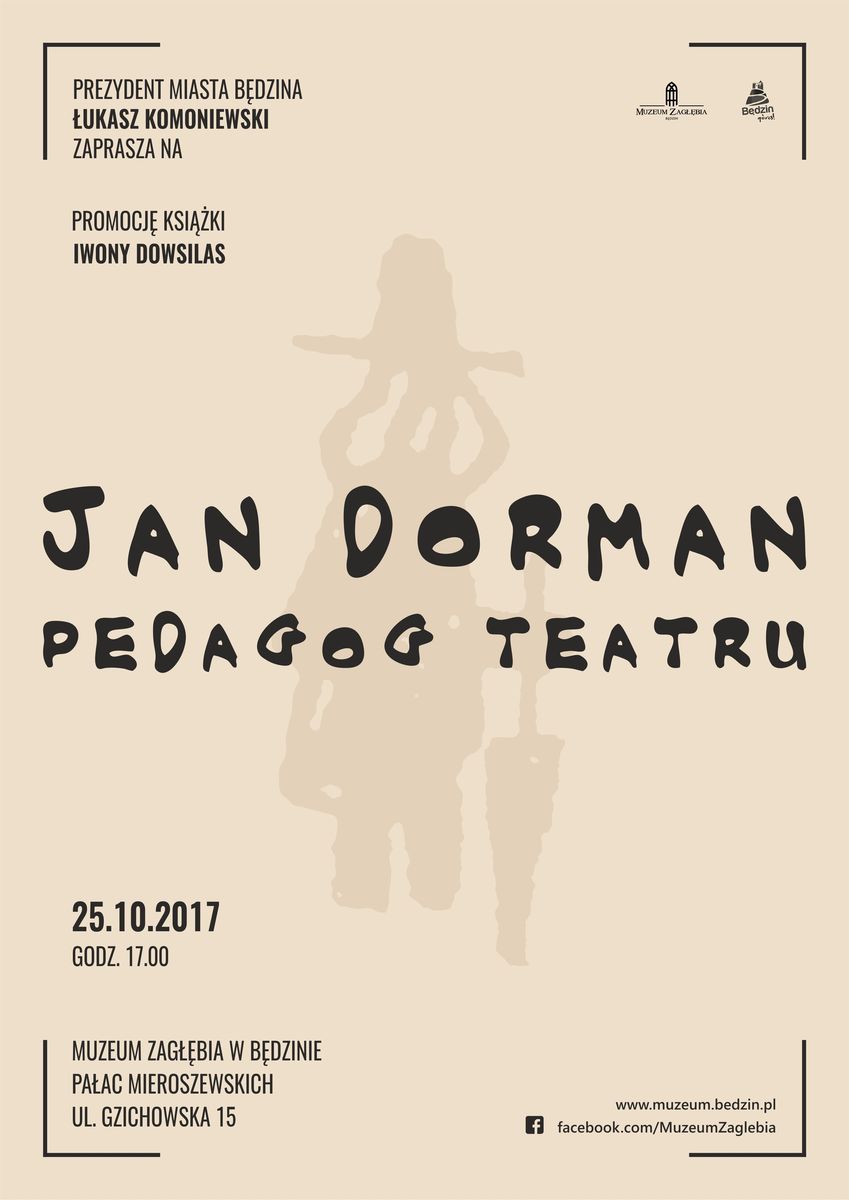 Prezydent Miasta Będzina Łukasz Komoniewski zaprasza na promocje książki Iwony Dowsilas pt. „Jan Dorman - pedagog teatru”, która odbędzie się 25 października 2017 r. o godzinie 17:00 w Pałacu Mieroszewskich.