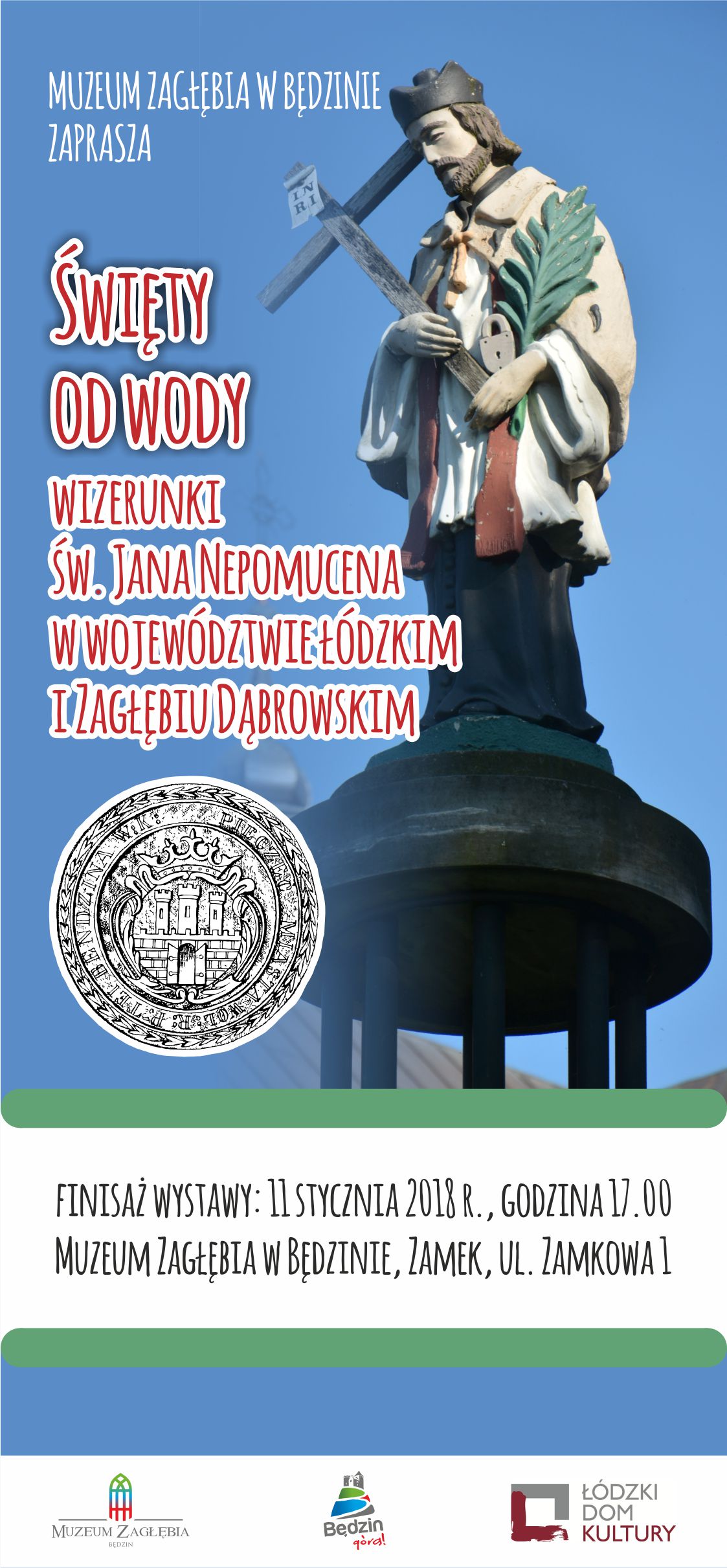 Muzeum Zagłębia w Będzinie zaprasza na finisaż wystawy „Święty od wody – wizerunki Jana Nepomucena w województwie łódzkim i Zagłębiu Dąbrowskim”, który odbędzie się 11 stycznia 2018 r. w Zamku o godzinie 17.00. Gościem finisażu wystawy będzie etnolog Andrzej Białkowski z Działu Dziedzictwa Kulturowego i Folkloru Regionów Łódzkiego Domu Kultury.