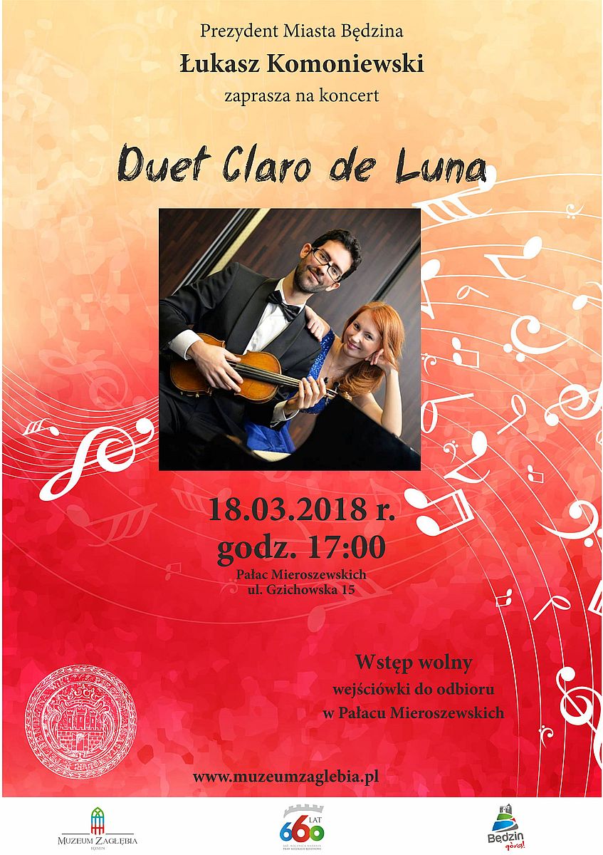 Prezydent Miasta Będzina Łukasz Komoniewski zaprasza na koncert duetu Claro de Luna, który odbędzie się 18 marca 2018 r. o godzinie 17.00 w Pałacu Mieroszewskich. W programie m.in nostalgiczna ,,Medytacja'' Juliusza Masseneta, piękna Siciliana Jana Sebastiana Bacha oraz transkrypcja na skrzypce i fortepian słynnego utworu ,,Time to say goodbye''.