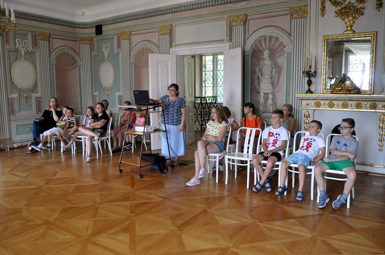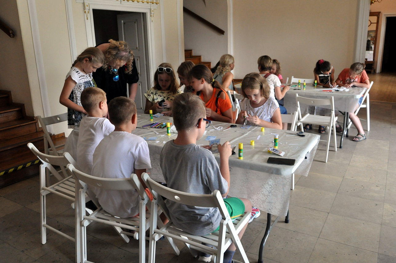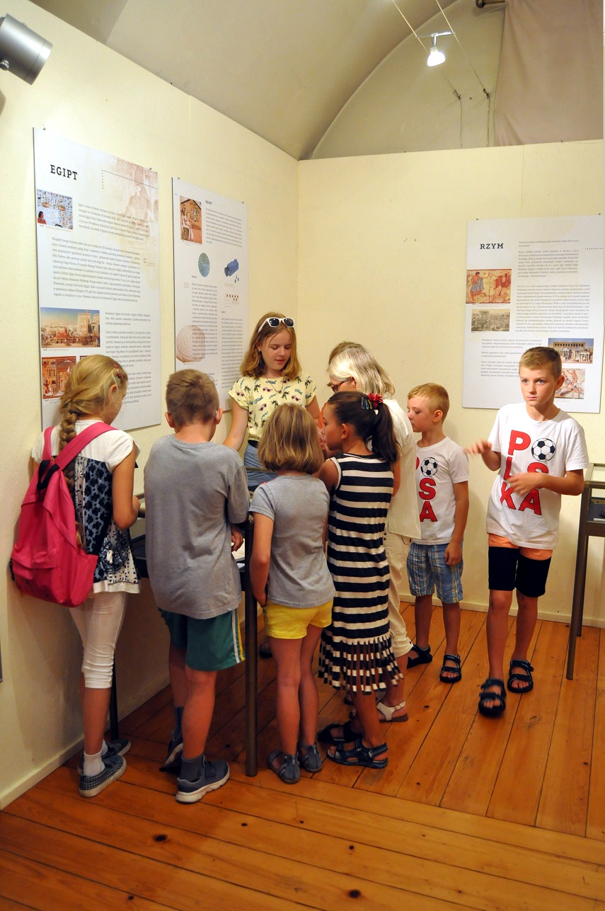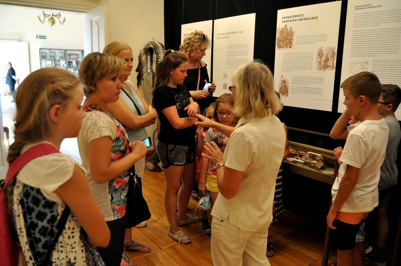 W pierwszą środę sierpnia muzealne, wakacyjne warsztaty dla dzieci rozpoczęły się od zwiedzania wystawy poświęconej historii gier planszowych od zarania dziejów po średniowiecze.