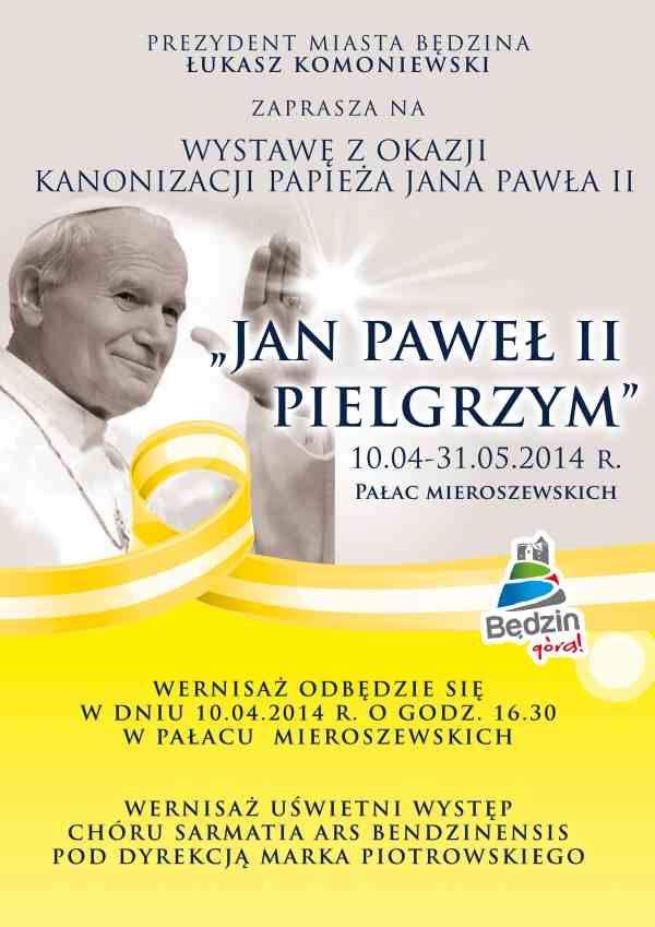 Prezydent Miasta Będzina Łukasz Komoniewski i Komandor Komandorii Zagłębiowskiej Orderu Świętego Stanisława Henryk Bebak zapraszają na wernisaż wystawy z okazji kanonizacji Papieża Jana Pawła II pn. "Jan Paweł II Pielgrzym".