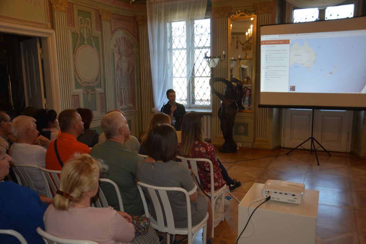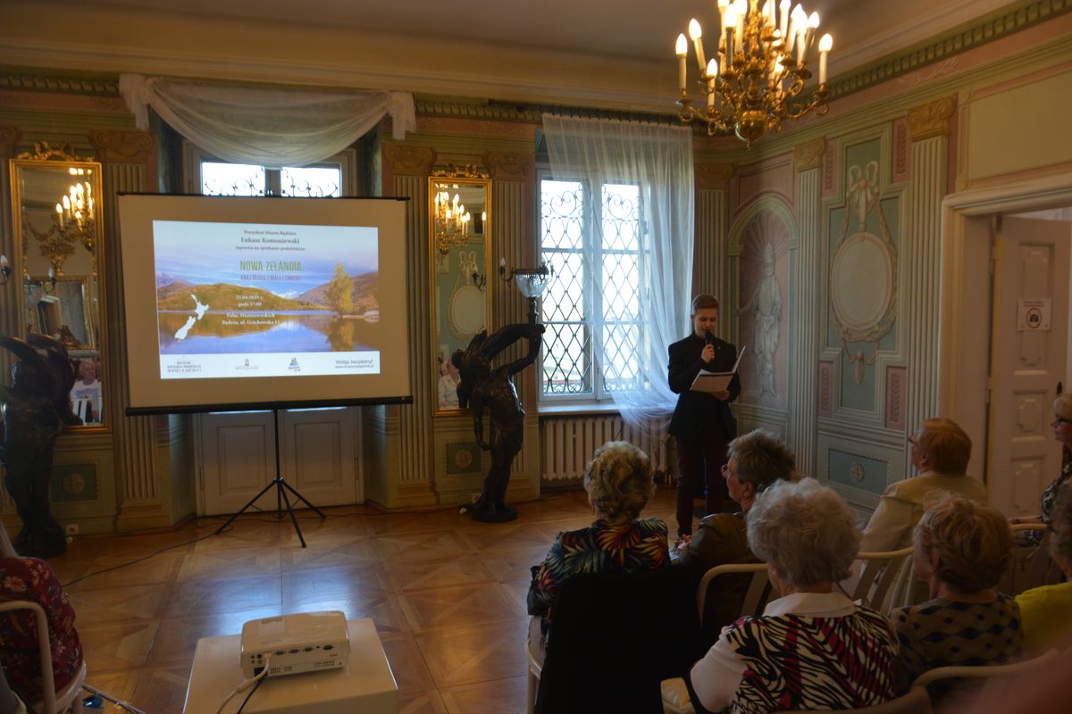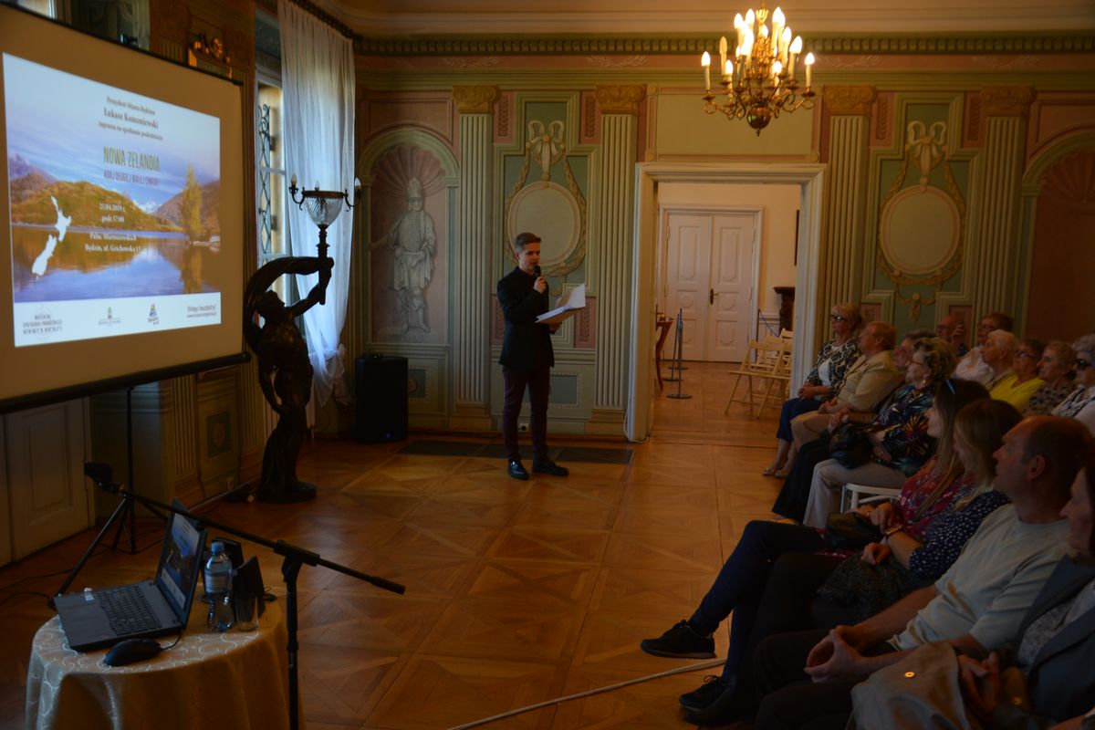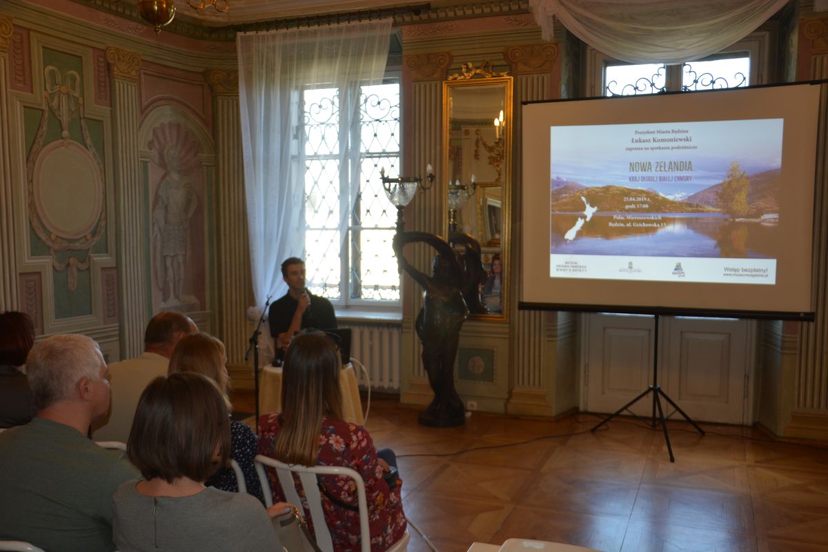 W czwartkowe popołudnie 25 kwietnia 2019 r. w Pałacu Mieroszewskich odbyło się kolejne spotkanie z cyklu „Muzealne Spotkanie Podróżnicze” pt. Nowa Zelandia – kraj długiej białej chmury. Wydarzenie swoim patronatem objął Prezydent Miasta Będzina Łukasz Komoniewski. Podczas spotkania Michał Walusza przybliżył kulturę, ciekawe obyczaje oraz tradycje mieszkańców Nowej Zelandii. Razem z podróżnikiem wzięliśmy udział w podniebnym trekkingu przez malownicze pasma górskie, zobaczyliśmy wiele niesamowitych zjawisk przyrodniczych, jaskinię tysiąca gwiazd oraz niezwykle magiczne miejsca znane z ekranizacji „Władcy Pierścieni”. Uczestnicy spotkania poznali również tradycyjny, maoryski taniec „Haka” powszechnie znany z relacji telewizyjnych, w których występuje reprezentacja rugby Nowej Zelandii. Szczególne wrażenie na słuchaczach wywarła relacja z wyjątkowo niebezpiecznej przeprawy promem z Wyspy Północnej na Wyspę Południową, której towarzyszą zazwyczaj porywiste wiatry i sztormy.