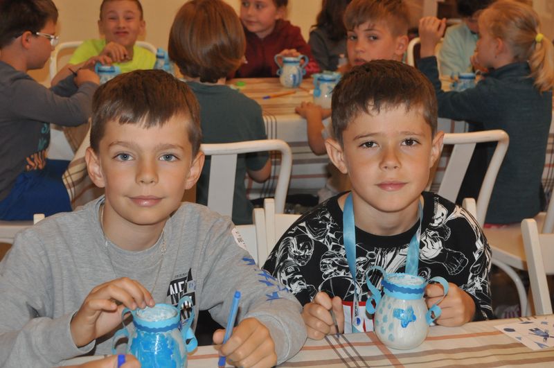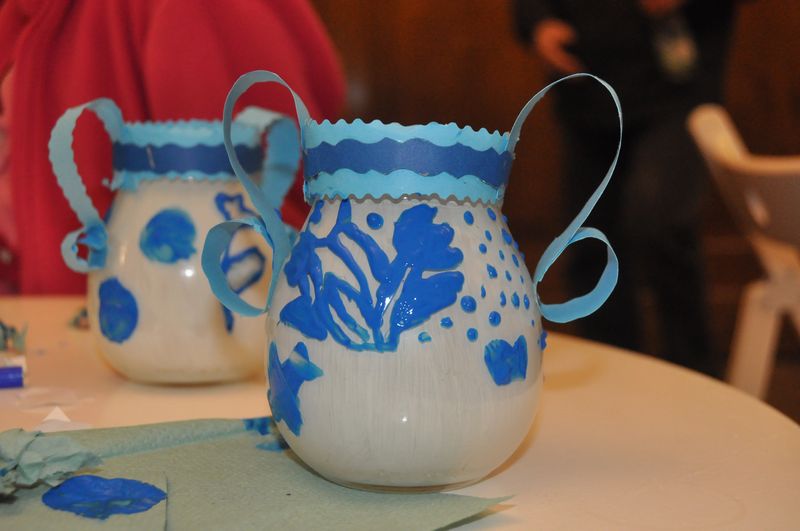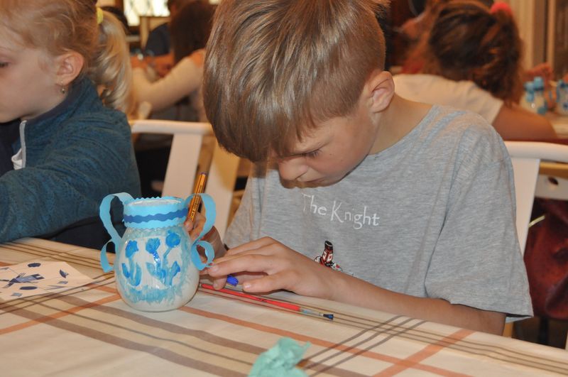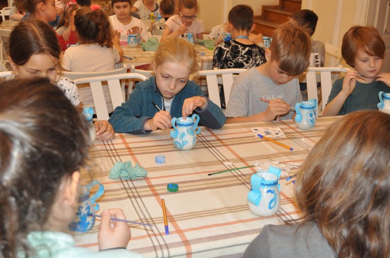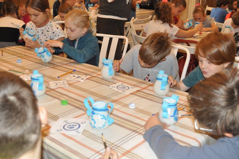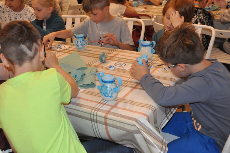 Na początku naszego spotkania wszyscy zapoznali się z cennym, muzealnym zabytkiem, czyli holenderską wazą i wysłuchali opowieści o Argonautach, ponieważ na naczyniu jest malunek przedstawiający załogę mitycznego Jazona. Jednak najważniejszym punktem warsztatów było malowanie małych wazonów w stylu naczyń produkowanych w dawnych Delftach – pięknym holenderskim miasteczku. Wszyscy bardzo się starali i kobaltowym kolorem pięknie ozdabiali swoje wazony. Kiedy farby na małych dziełach sztuki dosychały, uczniowie udali się do reprezentacyjnej sali w pałacu, gdzie wysłuchali prezentacji o naczyniach z Delft.
