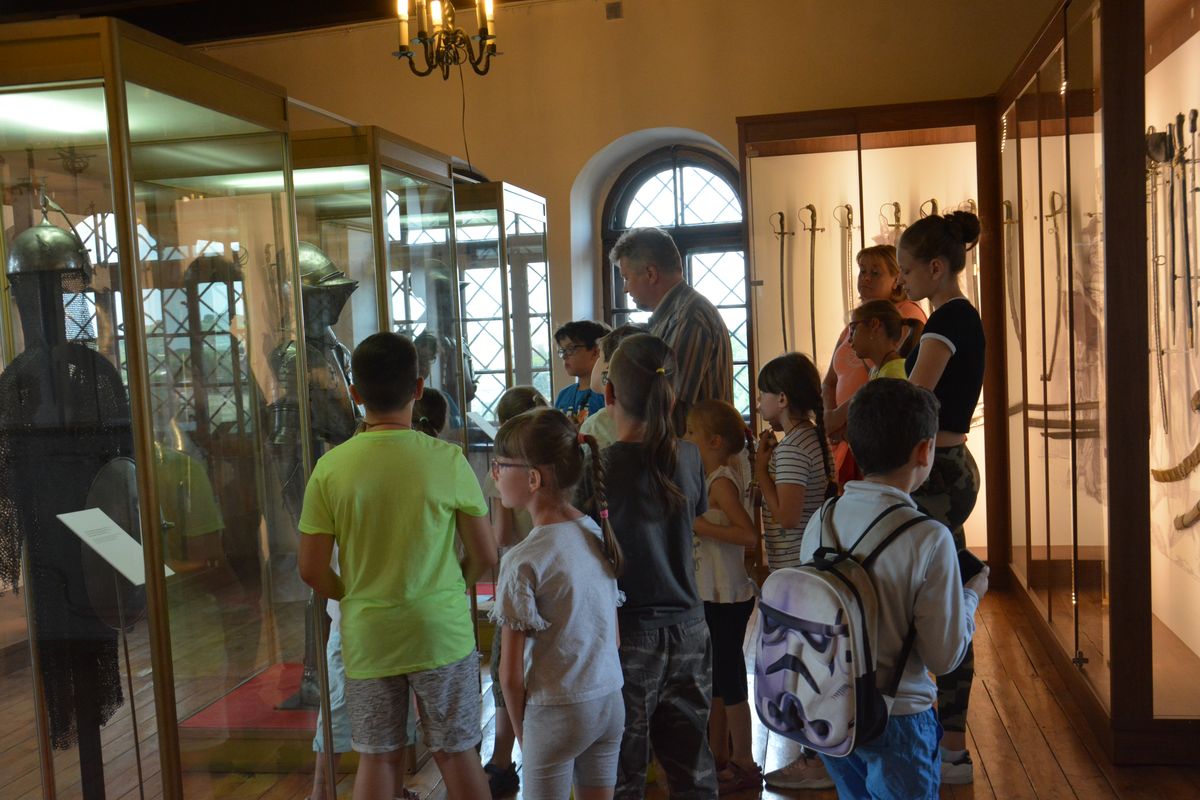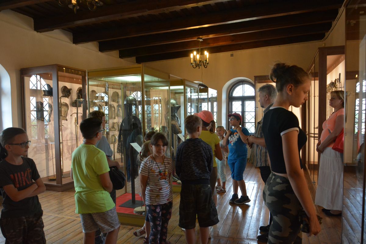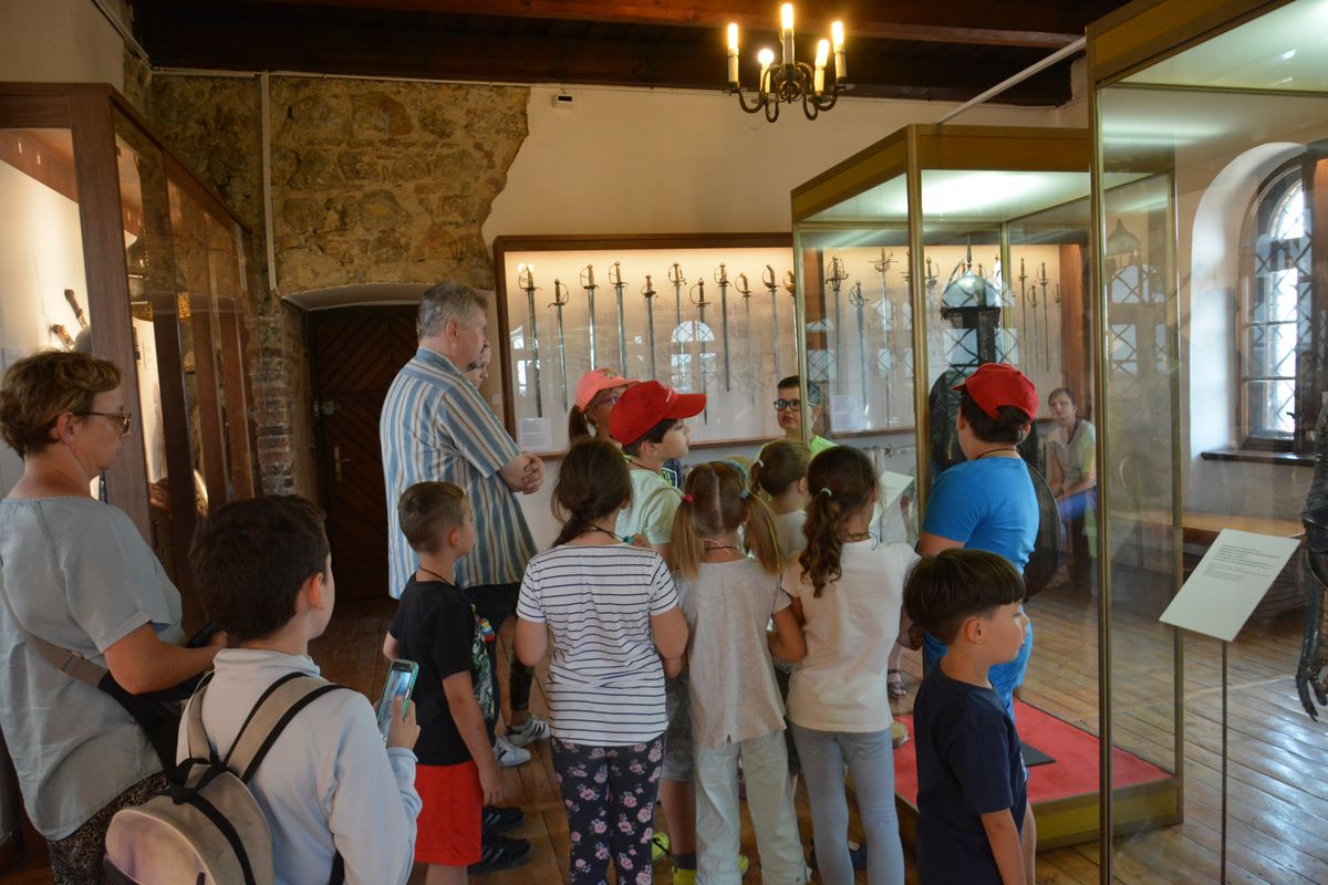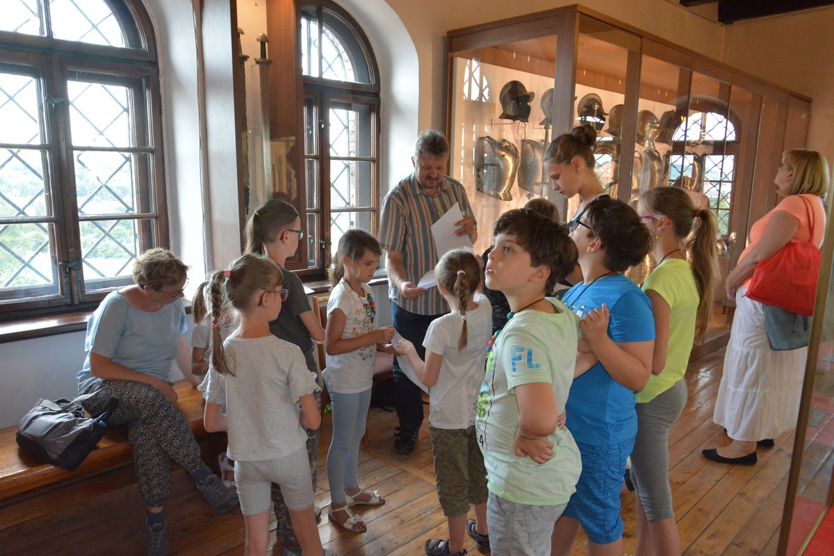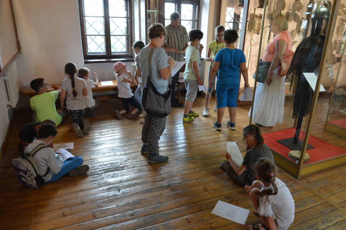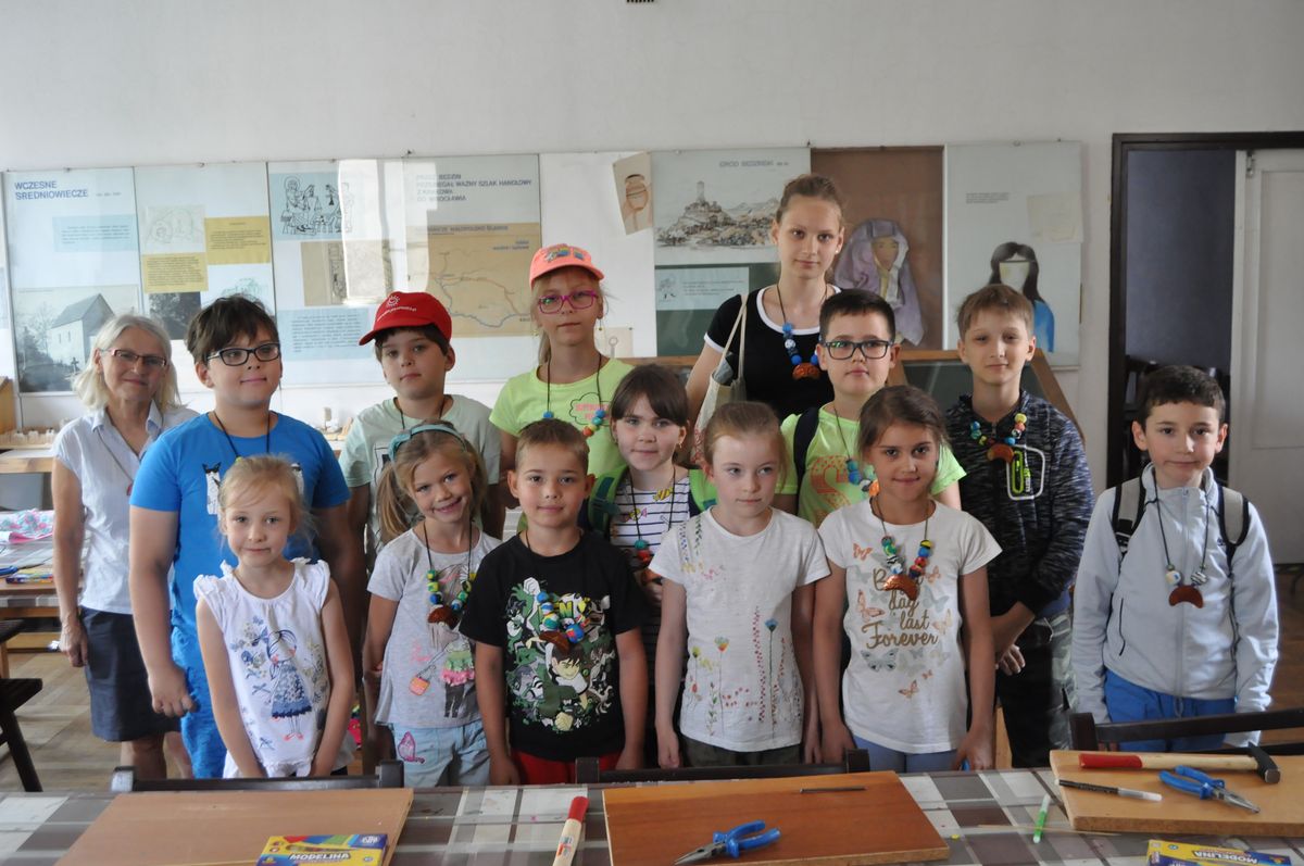 Kolejny dzień zajęć wakacyjnych w naszym muzeum upłynął pod znakiem będzińskiego średniowiecza. Z prezentacji rozpoczynającej spotkanie uczestnicy dowiedzieli się, co z tej odległej epoki zachowało się na - lub pod powierzchnią ziemi i jest nadal do obejrzenia. Następnym punktem programu były warsztaty, podczas których dzieci wykonały kolie z ulepionych własnoręcznie kolorowych paciorków ozdobioną miedzianą, repusowaną zawieszką - lunulą. Taki naszyjnik pasuje "jak ulał" do uszytej na modłę średniowieczną sukienki i można tak wystąpić na którymś z licznie ostatnio organizowanych festynów, czy pokazów rycerskich. O rycerzach traktowała druga część zajęć, która miała miejsce w Zamku. Uczestnicy muzealnych zajęć mogli przekonać się jak poprzez pazia oraz giermka, młody mężczyzna mógł zostać pasowany na rycerza. Uczestnicy zajęć zobaczyli jak wyglądała zbroja rycerska, z jakich elementów się składała oraz jakiej broni używał rycerz. Dzieci dowiedziały się także, jakimi zasadami musiała się kierować w swym postępowaniu osoba, chcąca wstąpić do stanu rycerskiego. Zwieńczeniem zajęć było rozwiązywanie krzyżówek związanych ze średniowieczną tematyką.