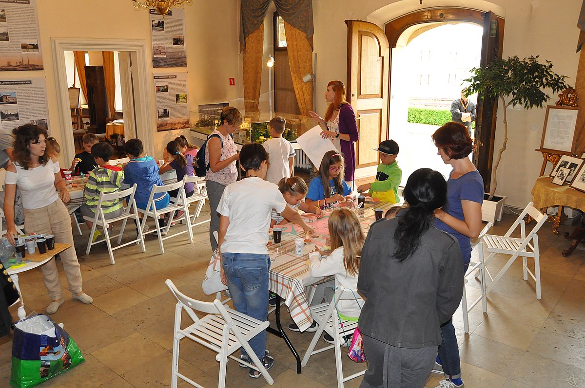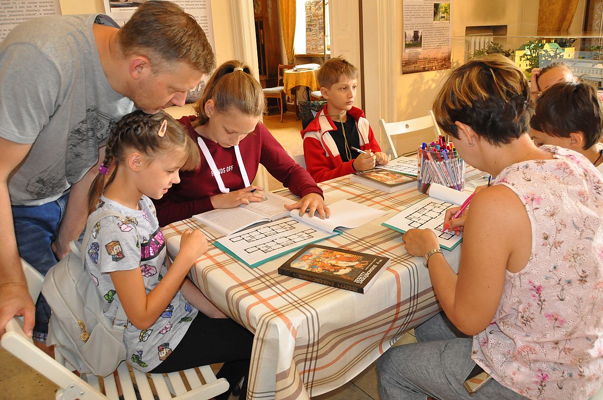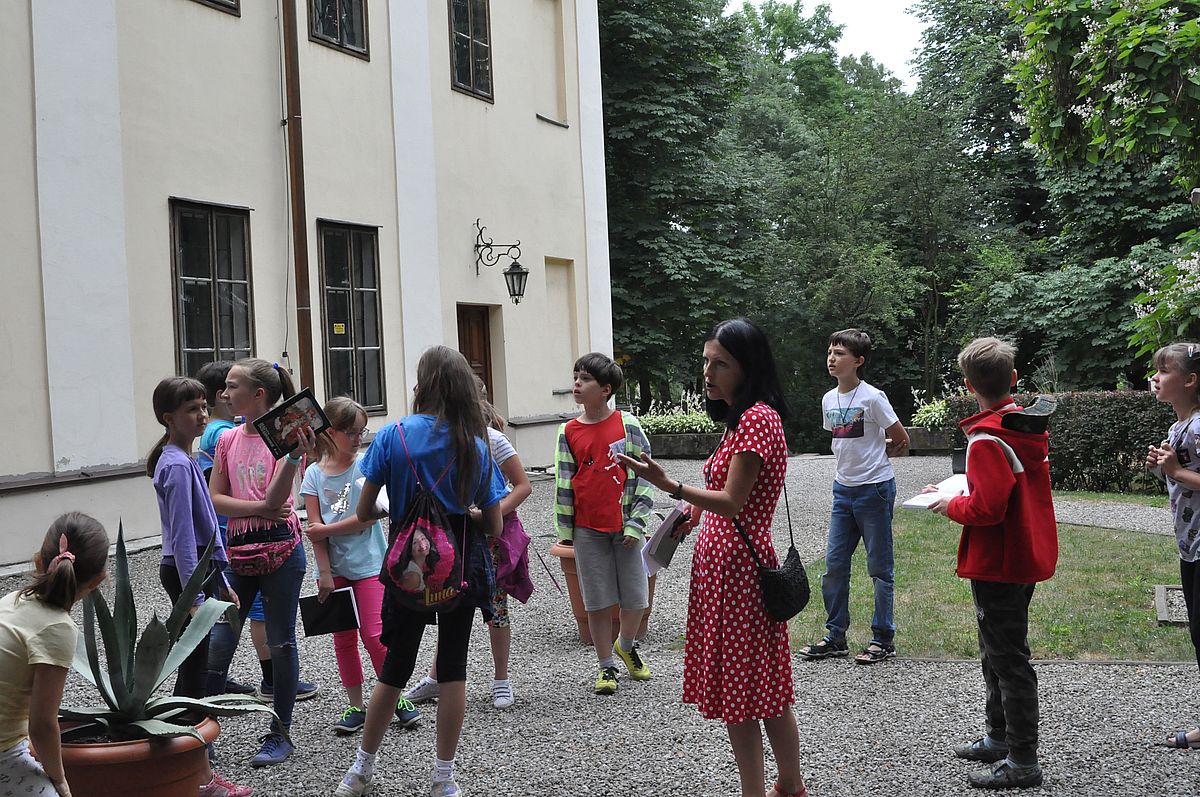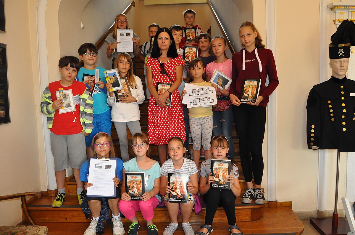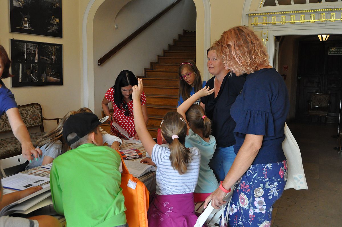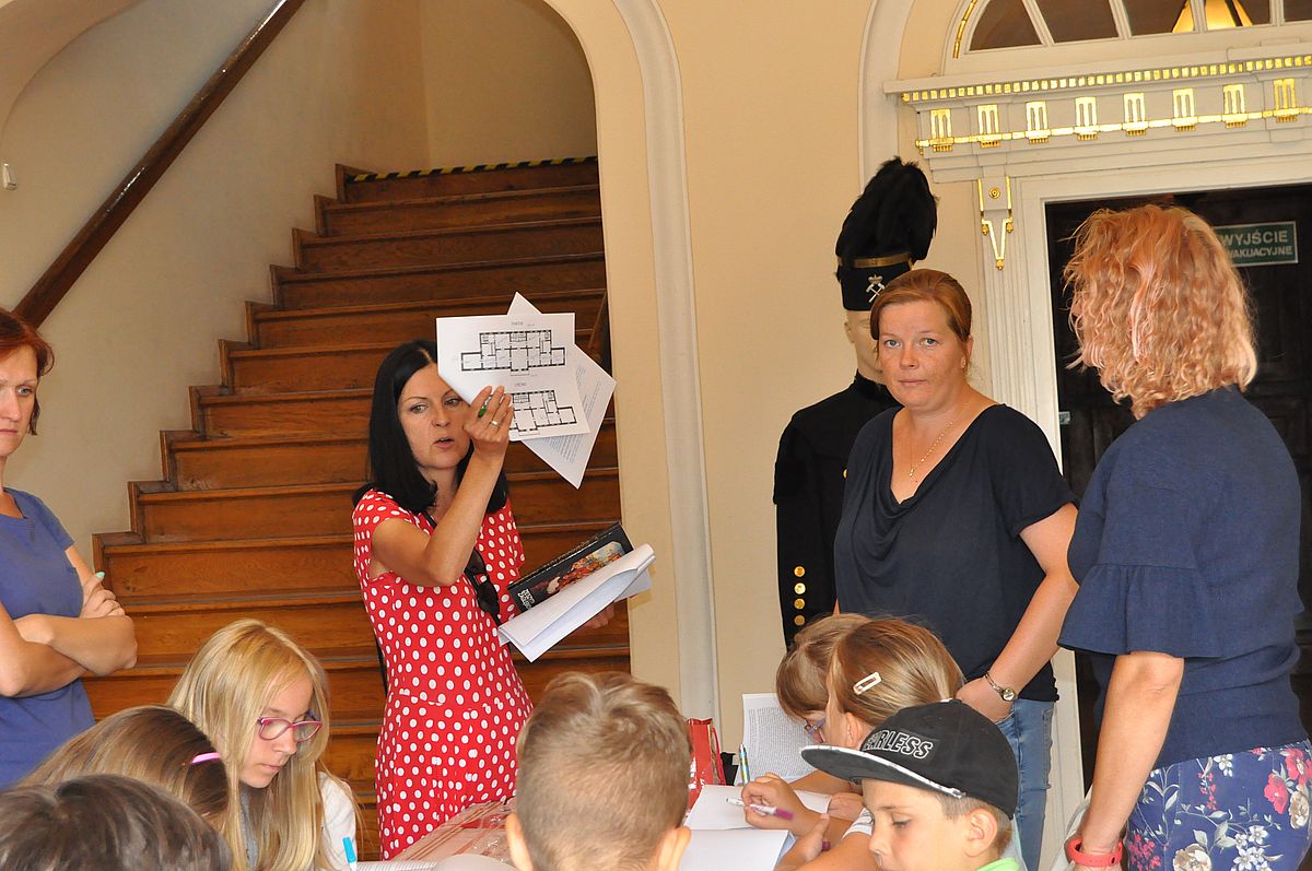 Na początek zaplanowano grę terenową „Wspomnienie o Gzichowie, czyli perypetie stróża nocnego Mitki”. Zajęcia miały przybliżyć życie właścicieli pałacu w okresie międzywojennym. W tym czasie w Pałacu Mieroszewskich mieszkała rodzina Krąkowskich. Mieczysław Krąkowski był administratorem Dóbr i Lasów Sosnowieckiego Towarzystwa Kopalń i Zakładów. Przed uczestnikami postawiono nie lada trudne zadanie - wymagające spostrzegawczości, umiejętności uważnego czytania tekstu i orientacji w terenie. Dzieci uczestniczące w zajęciach miały pomóc stróżowi nocnemu, niejakiemu Mitce odnaleźć pana administratora, któremu miał dostarczyć „tajemniczą przesyłkę” z przyszłości. W odnalezieniu przesyłki pomógł im tekst pamiętnika braci Krakowskich, który drukowany był swego czasu w „Zeszytach Zagłębiowskich”. Tajemniczą przesyłka została odnaleziona w jednej z sal na I piętrze Pałacu. Zawierała pamiątki muzealne dla uczestników naszych dzisiejszych zajęć.