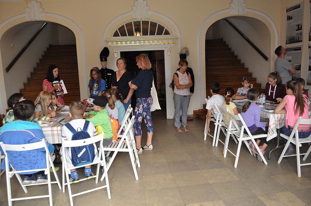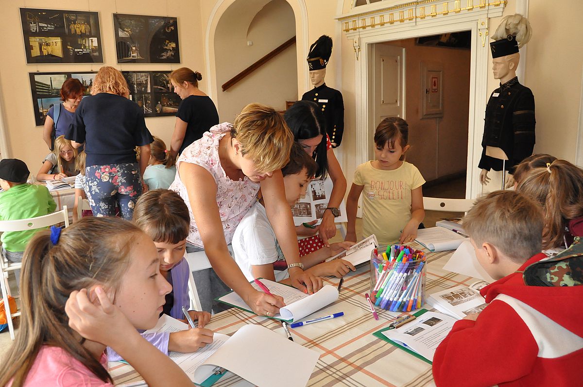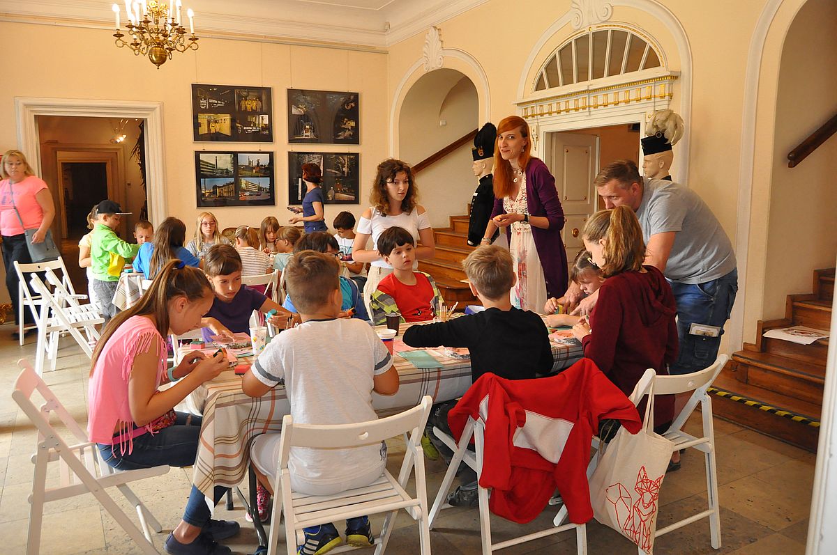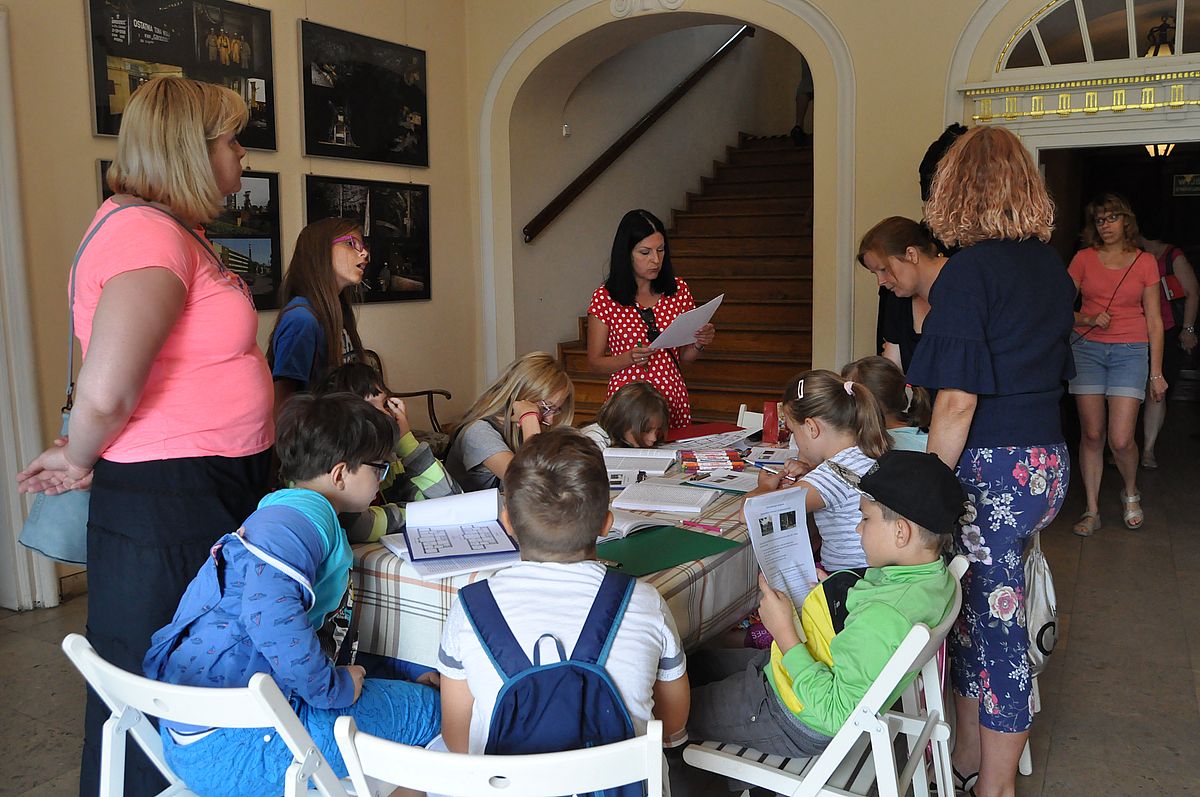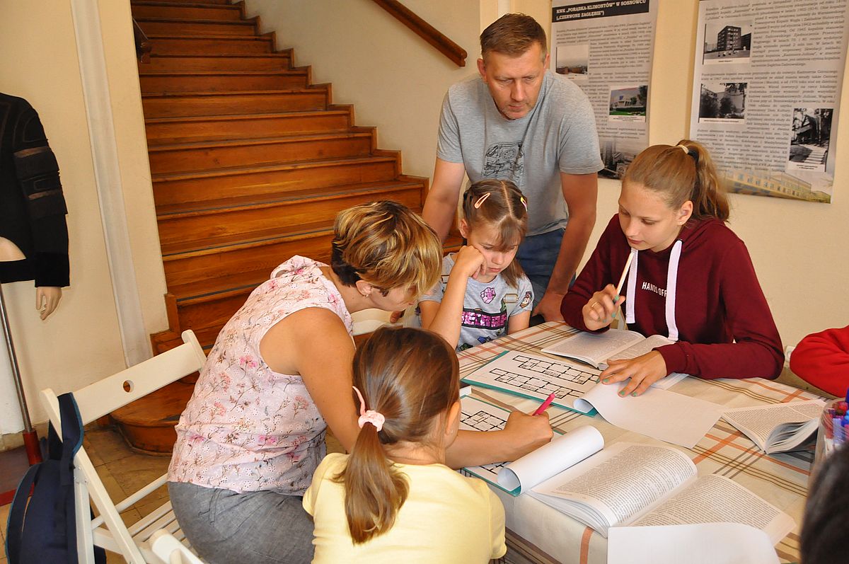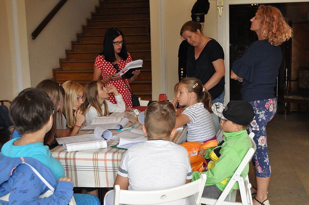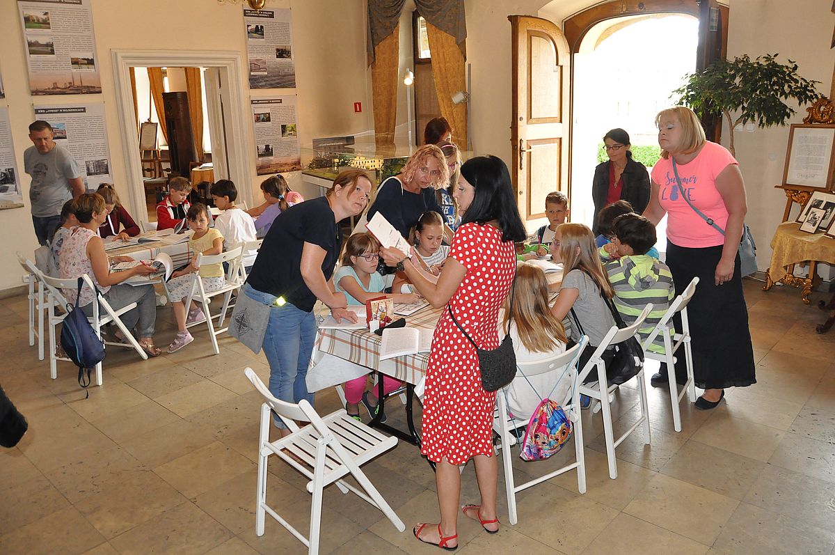 Na początek zaplanowano grę terenową „Wspomnienie o Gzichowie, czyli perypetie stróża nocnego Mitki”. Zajęcia miały przybliżyć życie właścicieli pałacu w okresie międzywojennym. W tym czasie w Pałacu Mieroszewskich mieszkała rodzina Krąkowskich. Mieczysław Krąkowski był administratorem Dóbr i Lasów Sosnowieckiego Towarzystwa Kopalń i Zakładów. Przed uczestnikami postawiono nie lada trudne zadanie - wymagające spostrzegawczości, umiejętności uważnego czytania tekstu i orientacji w terenie. Dzieci uczestniczące w zajęciach miały pomóc stróżowi nocnemu, niejakiemu Mitce odnaleźć pana administratora, któremu miał dostarczyć „tajemniczą przesyłkę” z przyszłości. W odnalezieniu przesyłki pomógł im tekst pamiętnika braci Krakowskich, który drukowany był swego czasu w „Zeszytach Zagłębiowskich”. Tajemniczą przesyłka została odnaleziona w jednej z sal na I piętrze Pałacu. Zawierała pamiątki muzealne dla uczestników naszych dzisiejszych zajęć.