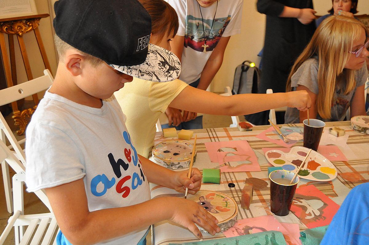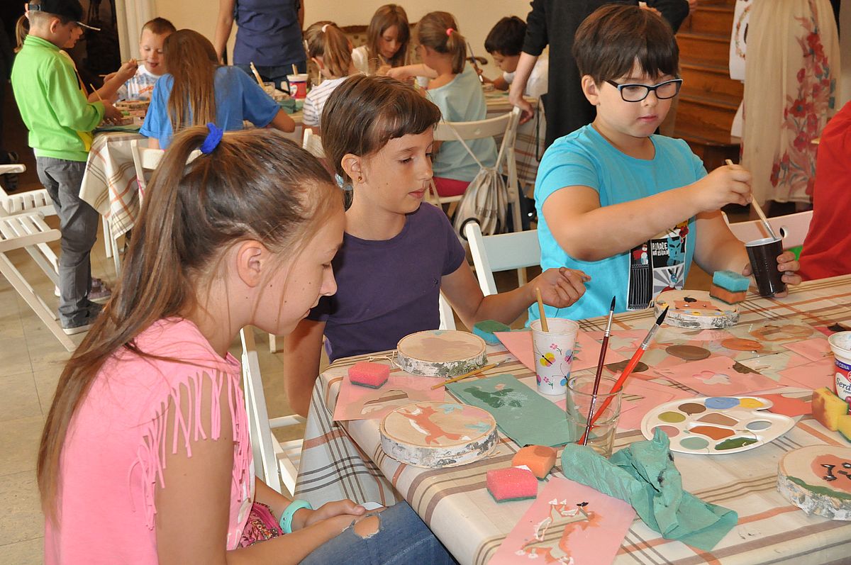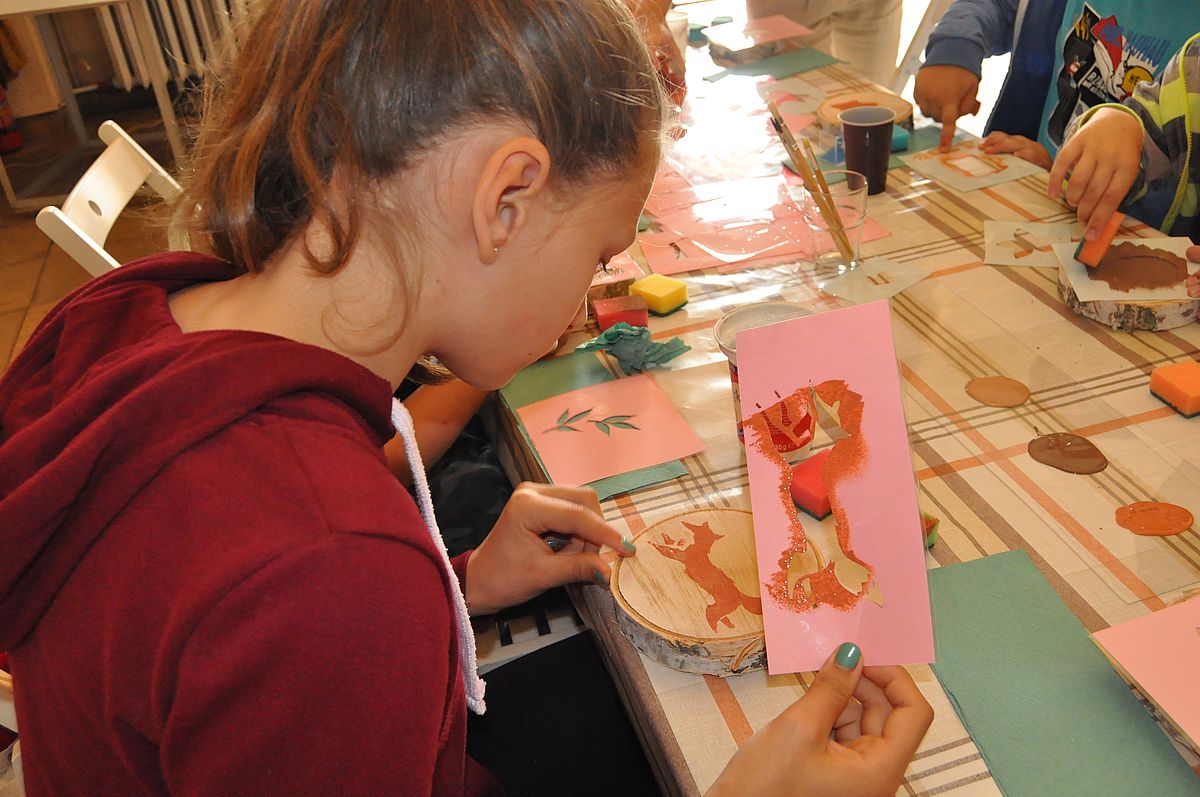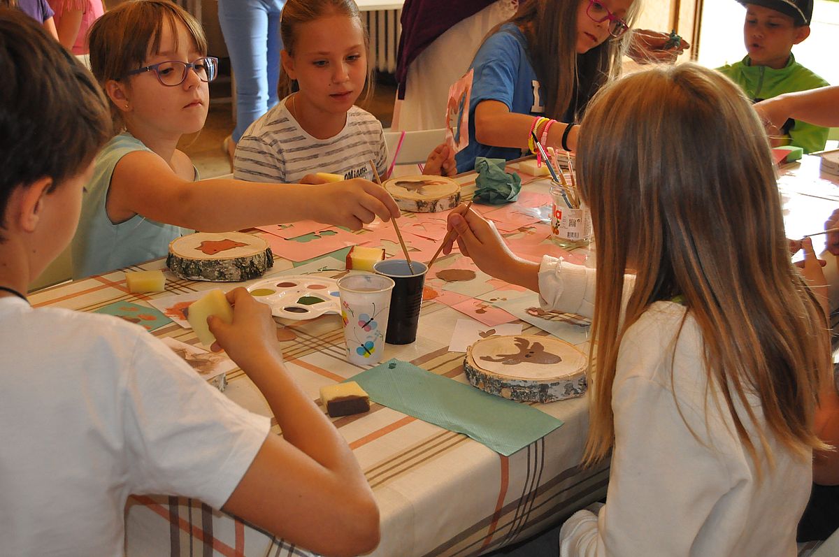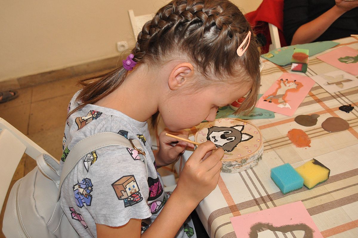 Następnie odbyły się zajęcia plastyczne. Podczas warsztatów „Malowanie na plastrze drewna” uczestnicy mieli niepowtarzalną okazję stworzenia własnej, unikatowej, leśnej ozdoby. Dzięki farbom i szablonom, każdy z nich mógł namalować na plastrze brzozy podobiznę lisa, wilka lub niedźwiedzia ozdobioną wiankiem z polnych kwiatów. Podczas warsztatów panowała fantastyczna, przyjacielska atmosfera, pełna śmiechu, rozmów i kreatywności. Z zajęć wszyscy wyszli uśmiechnięci i dumni ze swojej pracy.