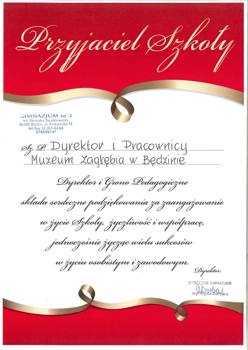 Miło nam poinformować, że Muzeum Zagłębia otrzymało od Gimnazjum nr 3 im. Henryka Sienkiewicza w Będzinie tytuł „Przyjaciela Szkoły”.