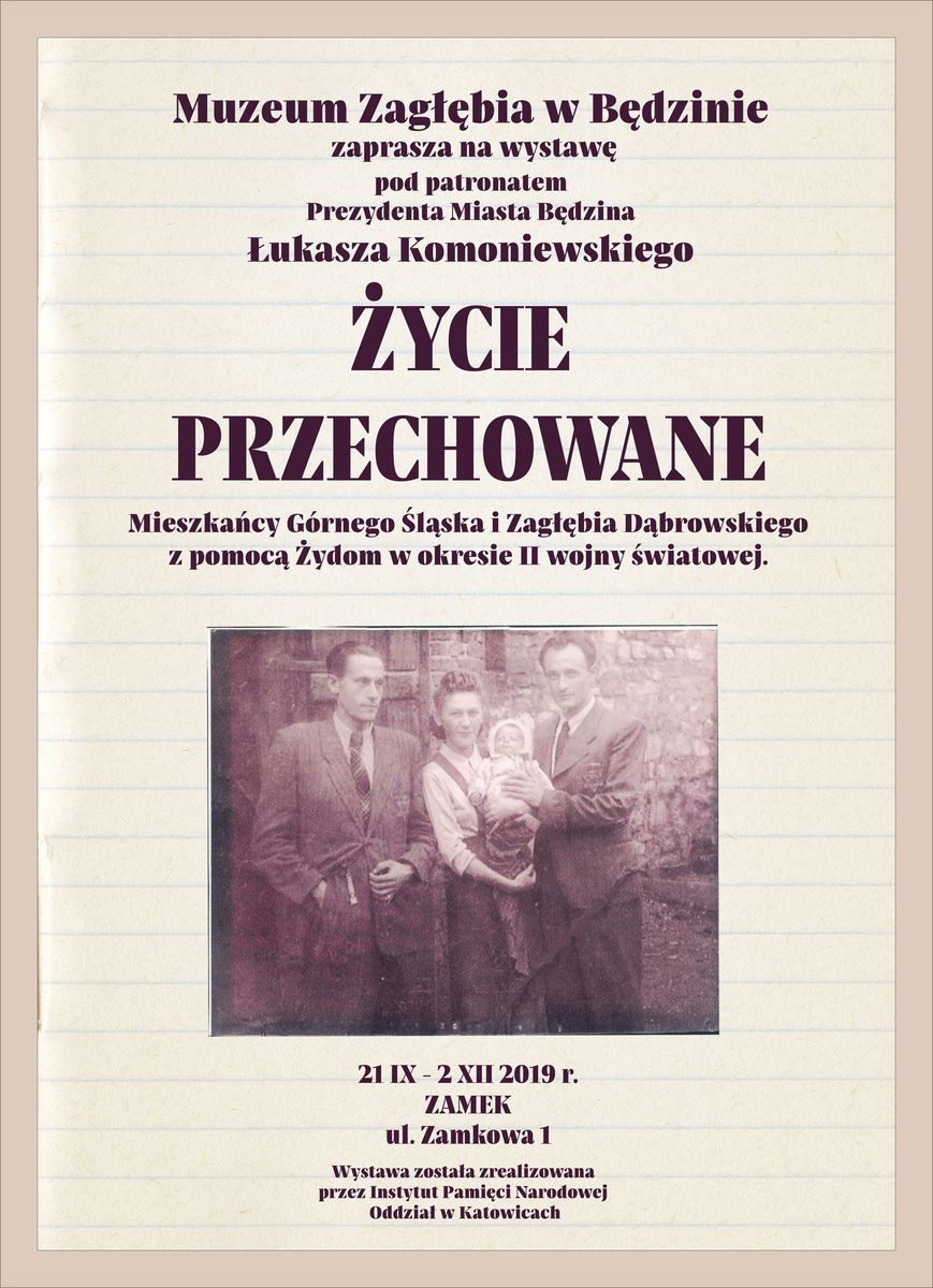 Wystawę patronatem objął Prezydenta Miasta Będzina Łukasz Komoniewski. Ekspozycja upamiętnia Polaków, którzy udzielali pomocy ludności żydowskiej w czasie II wojny światowej, na terenie Górnego Śląska i Zagłębia Dąbrowskiego. Część wyeksponowanych tu materiałów jest bezpośrednio związana z Będzinem i okolicami. Miasto to ze względu na strukturę narodowościową i religijną, było miejscem dramatycznych wydarzeń związanych z Holokaustem, który zgotowali niemieccy okupanci. Bohaterstwo Polaków ratujących Żydów w czasie II wojny światowej, bardzo często w późniejszych latach było zapomniane. Dzięki ekspozycji przygotowanej przez katowicki Oddział Instytutu Pamięci Narodowej, zwiedzający mogą poznać tragiczne, poruszające dzieje osób wyznania mojżeszowego i heroizm osób narażających własne życie, ratując ich przed zagładą . Zaprezentowane na wystawie autentyczne historie, choć bardzo rozpaczliwe, kończą się przeważnie optymistycznie. Warto zatem odwiedzić Muzeum Zagłębia i bliżej zapoznać się z niezwykłymi opowieściami i osobami które zdobyły się na bohaterskie czyny oraz postaciami dzięki nim ocalonym. Wystawę można zwiedzać od 21 września do 2 grudnia 2019 roku w będzińskim Zamku.