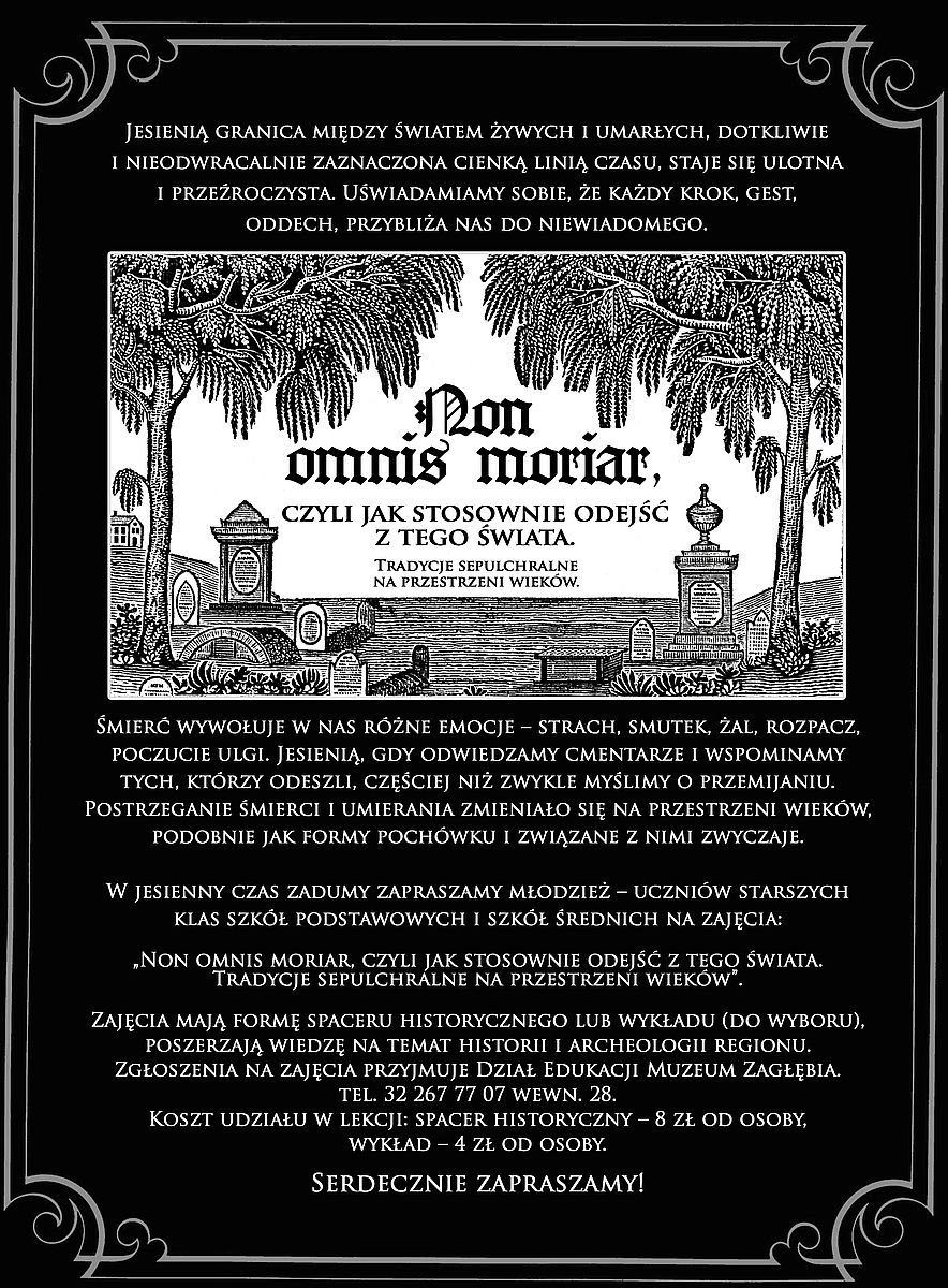 W jesienny czas zadumy zapraszamy młodzież – uczniów starszych klas szkół podstawowych i szkół średnich na zajęcia: „Non omnis moriar, czyli jak stosownie odejść z tego świata. Tradycje sepulchralne na przestrzeni wieków”. Zajęcia mają formę spaceru historycznego lub wykładu (do wyboru), poszerzają wiedzę na temat historii i archeologii regionu. Zgłoszenia na zajęcia przyjmuje Dział Edukacji Muzeum Zagłębia, tel. 32 267 77 07 wewn. 28. Koszt udziału w lekcji: spacer historyczny – 8 zł od osoby, wykład – 4 zł od osoby. Serdecznie zapraszamy.