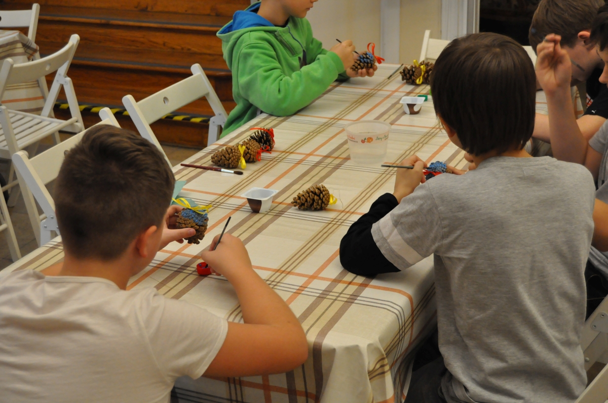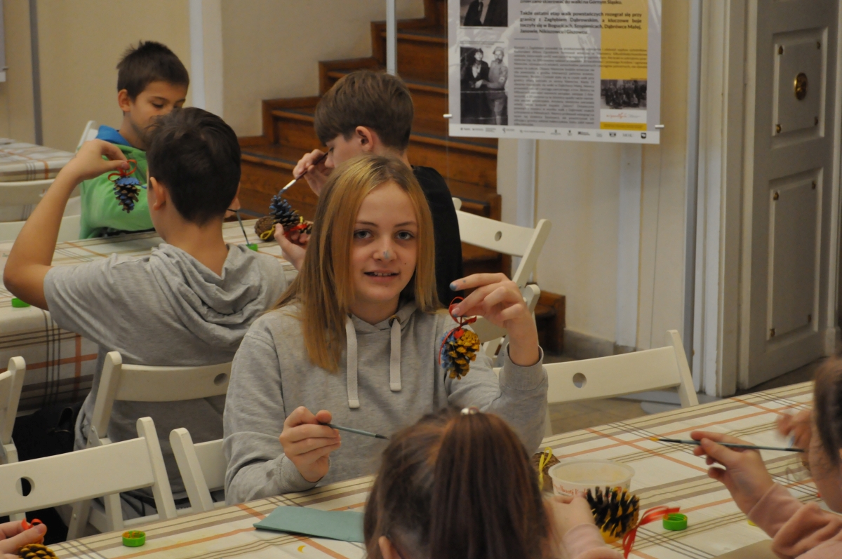 Od dzisiaj do Pałacu Mieroszewskich będą zmierzać grupy szkolne na wspólne spędzenie czasu przedświątecznego. Pamiątką z wtorkowych warsztatów są malowane, błyszczące świątecznym pyłem szyszki, które staną się wspaniałą ozdobą choinkową.