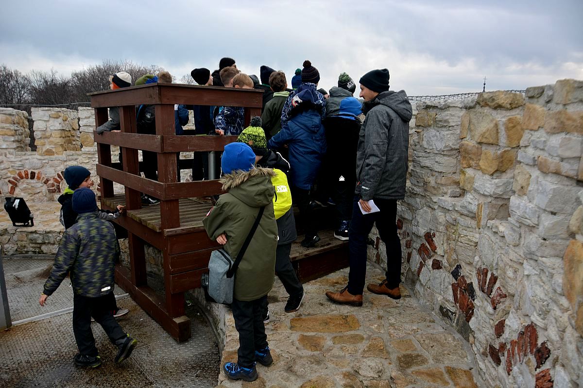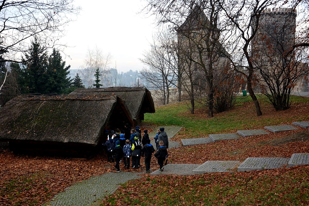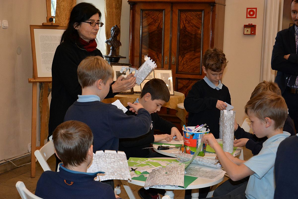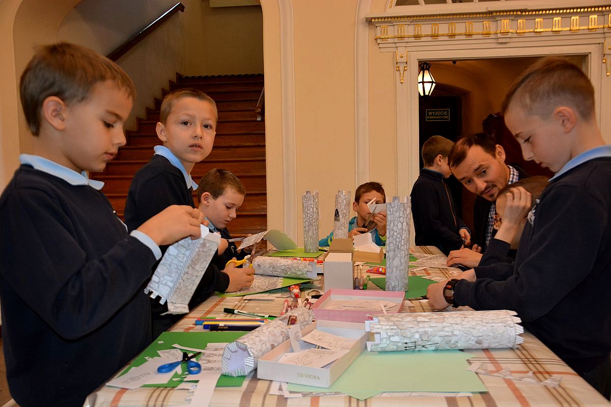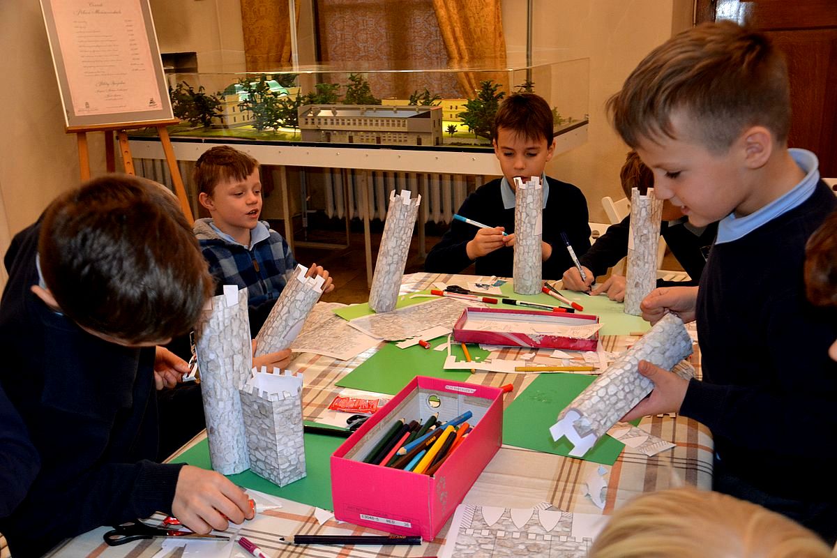 Zajęcia rozpoczęły się na Wzgórzu Zamkowym, gdzie uczestnicy dowiedzieli się, jak wyglądało życie w średniowiecznym grodzie. Wędrując wzdłuż murów obronnych Zamku zapoznali się z architekturą obronną będzińskiej warowni i zasadami wznoszenia fortyfikacji. Następnie, po pokonaniu stu siedmiu schodów prowadzących na stołp – najstarszą część Zamku, uczestnicy lekcji podziwiali panoramę współczesnego miasta i dowiedzieli się, jakie procesy i wydarzenia wpłynęły na jego układ. Kolejnym przystankiem dla młodych badaczy historii był most na Czarnej Przemszy. Po zapoznaniu się z rolą i znaczeniem rzeki na przestrzeni wieków, uczniowie wraz z opiekunami skierowali kroki do Pałacu Mieroszewskich, zachwycając się po drodze architekturą i rozplanowaniem gzichowskiego zespołu pałacowo – parkowego. Spacer zakończyło zwiedzanie wystaw: archeologicznej, przybliżającej temat warunków życia w osadzie kultury łużyckiej i w średniowiecznym grodzie oraz etnograficznej, która pozwoliła uczestnikom dowiedzieć się, jak wyglądało wyposażenie chaty zagłębiowskiej i zajęcia ludności. Podsumowaniem spaceru były warsztaty plastyczne, w czasie których uczestnicy wykonywali makiety średniowiecznego zamku i ozdabiali je, podążając za swoją wyobraźnią i kreatywnością.