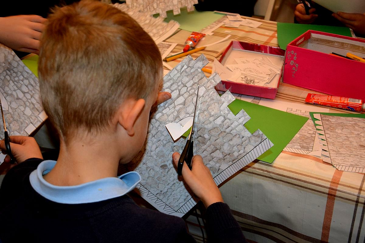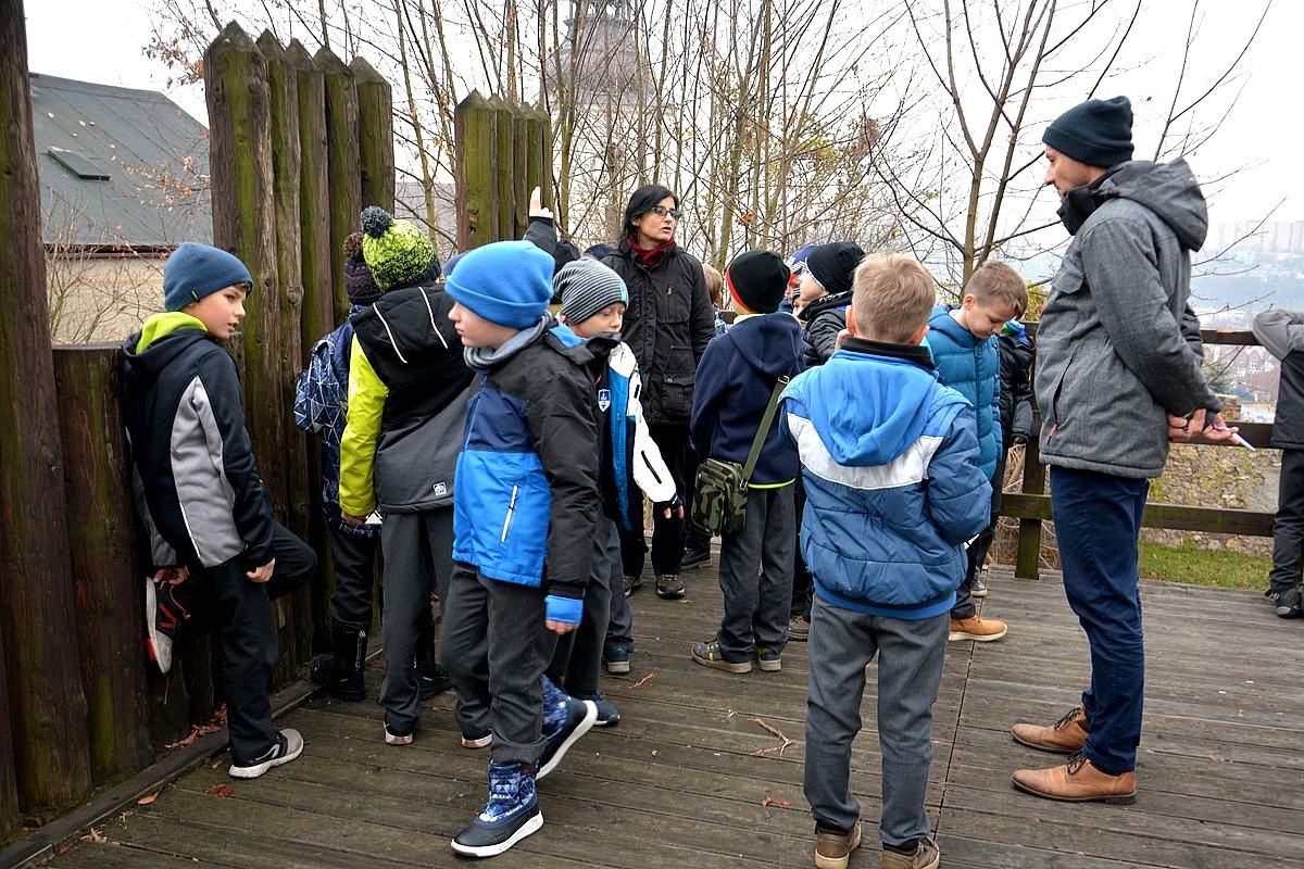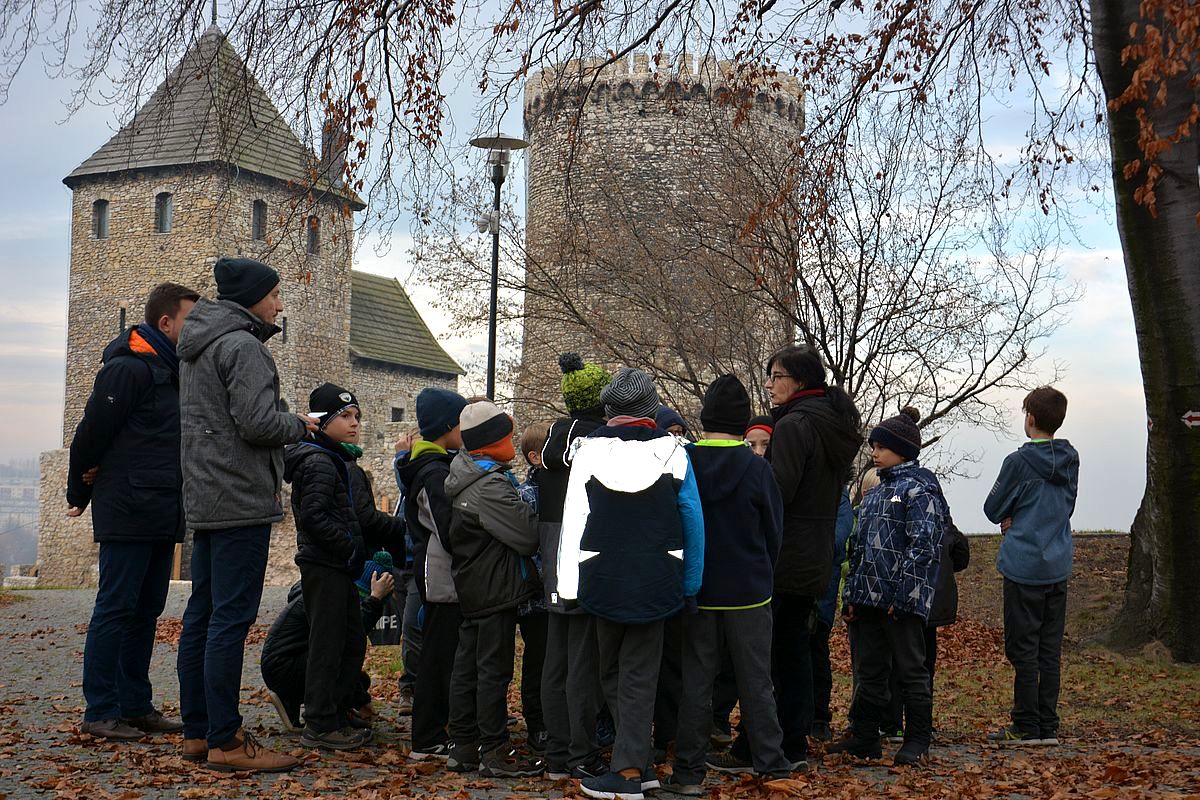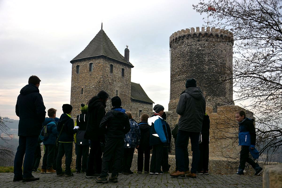 Zajęcia rozpoczęły się na Wzgórzu Zamkowym, gdzie uczestnicy dowiedzieli się, jak wyglądało życie w średniowiecznym grodzie. Wędrując wzdłuż murów obronnych Zamku zapoznali się z architekturą obronną będzińskiej warowni i zasadami wznoszenia fortyfikacji. Następnie, po pokonaniu stu siedmiu schodów prowadzących na stołp – najstarszą część Zamku, uczestnicy lekcji podziwiali panoramę współczesnego miasta i dowiedzieli się, jakie procesy i wydarzenia wpłynęły na jego układ. Kolejnym przystankiem dla młodych badaczy historii był most na Czarnej Przemszy. Po zapoznaniu się z rolą i znaczeniem rzeki na przestrzeni wieków, uczniowie wraz z opiekunami skierowali kroki do Pałacu Mieroszewskich, zachwycając się po drodze architekturą i rozplanowaniem gzichowskiego zespołu pałacowo – parkowego. Spacer zakończyło zwiedzanie wystaw: archeologicznej, przybliżającej temat warunków życia w osadzie kultury łużyckiej i w średniowiecznym grodzie oraz etnograficznej, która pozwoliła uczestnikom dowiedzieć się, jak wyglądało wyposażenie chaty zagłębiowskiej i zajęcia ludności. Podsumowaniem spaceru były warsztaty plastyczne, w czasie których uczestnicy wykonywali makiety średniowiecznego zamku i ozdabiali je, podążając za swoją wyobraźnią i kreatywnością.