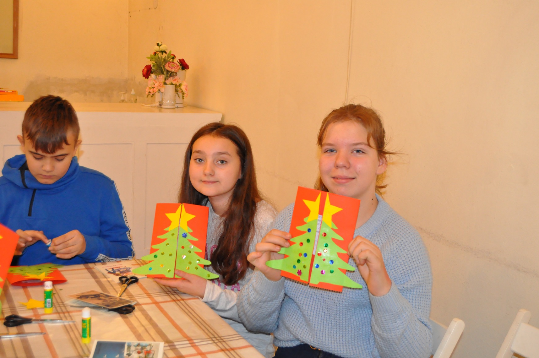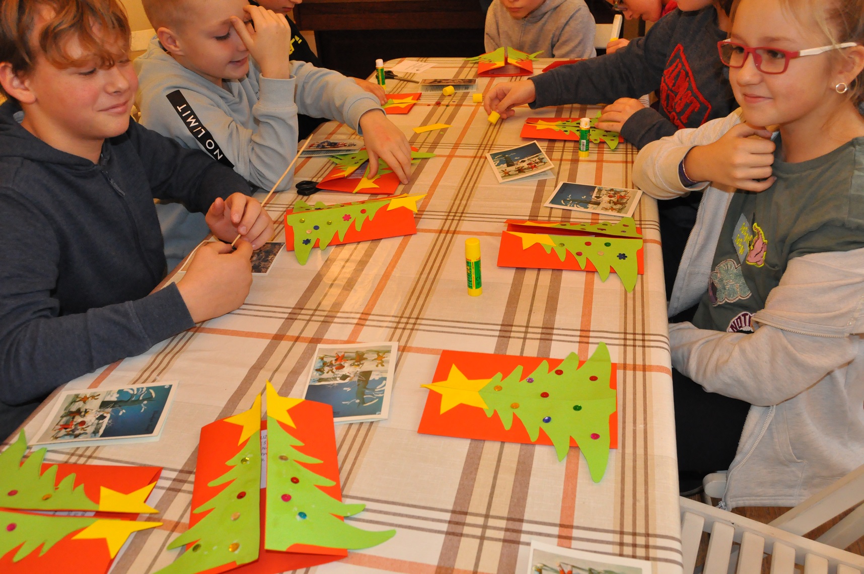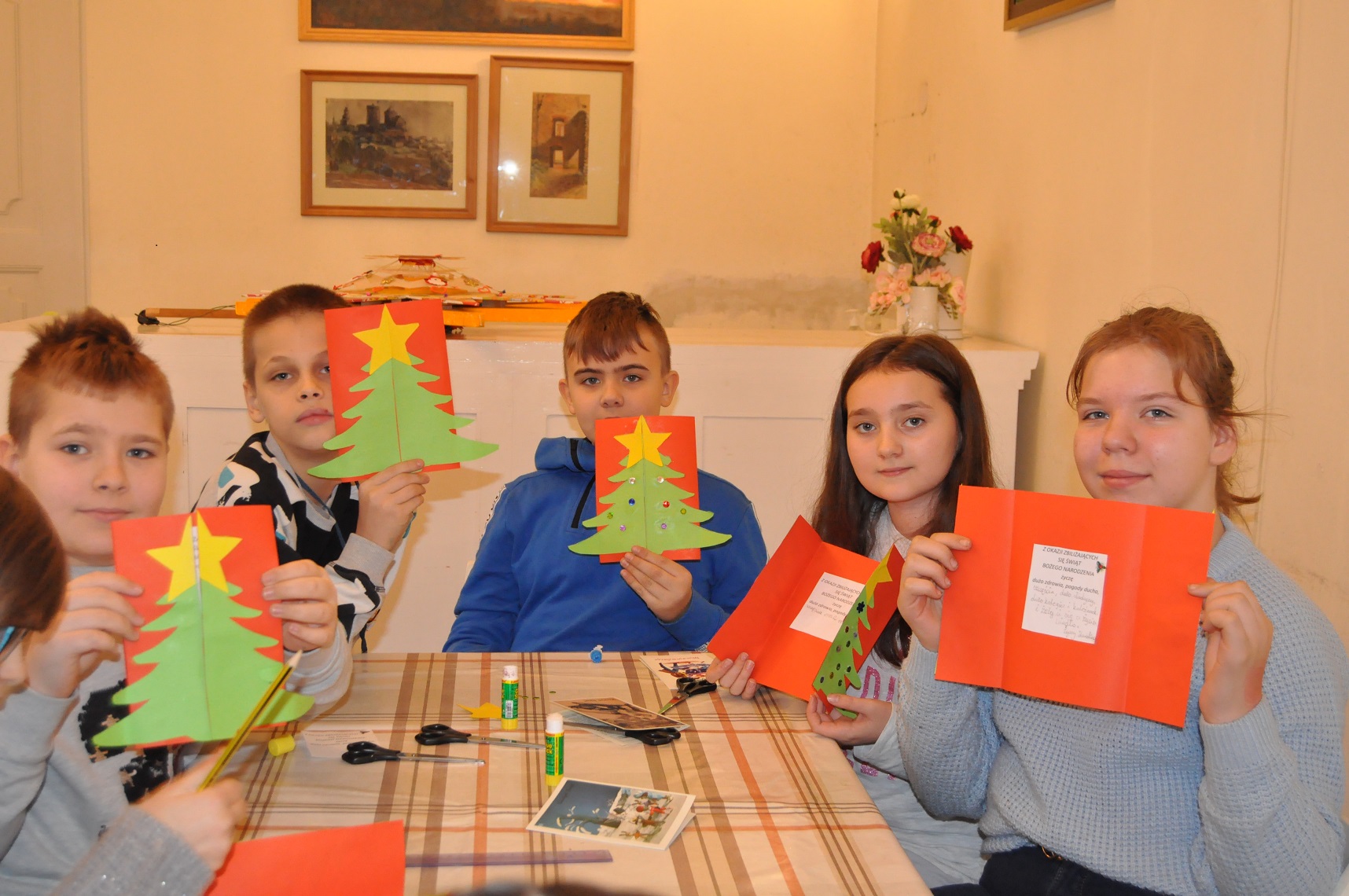 Na dworze szaro, trochę ponuro, a w Pałacu Mieroszewskich bardzo świątecznie, ponieważ nasi uczestnicy warsztatów wykonują piękne pocztówki bożonarodzeniowe.