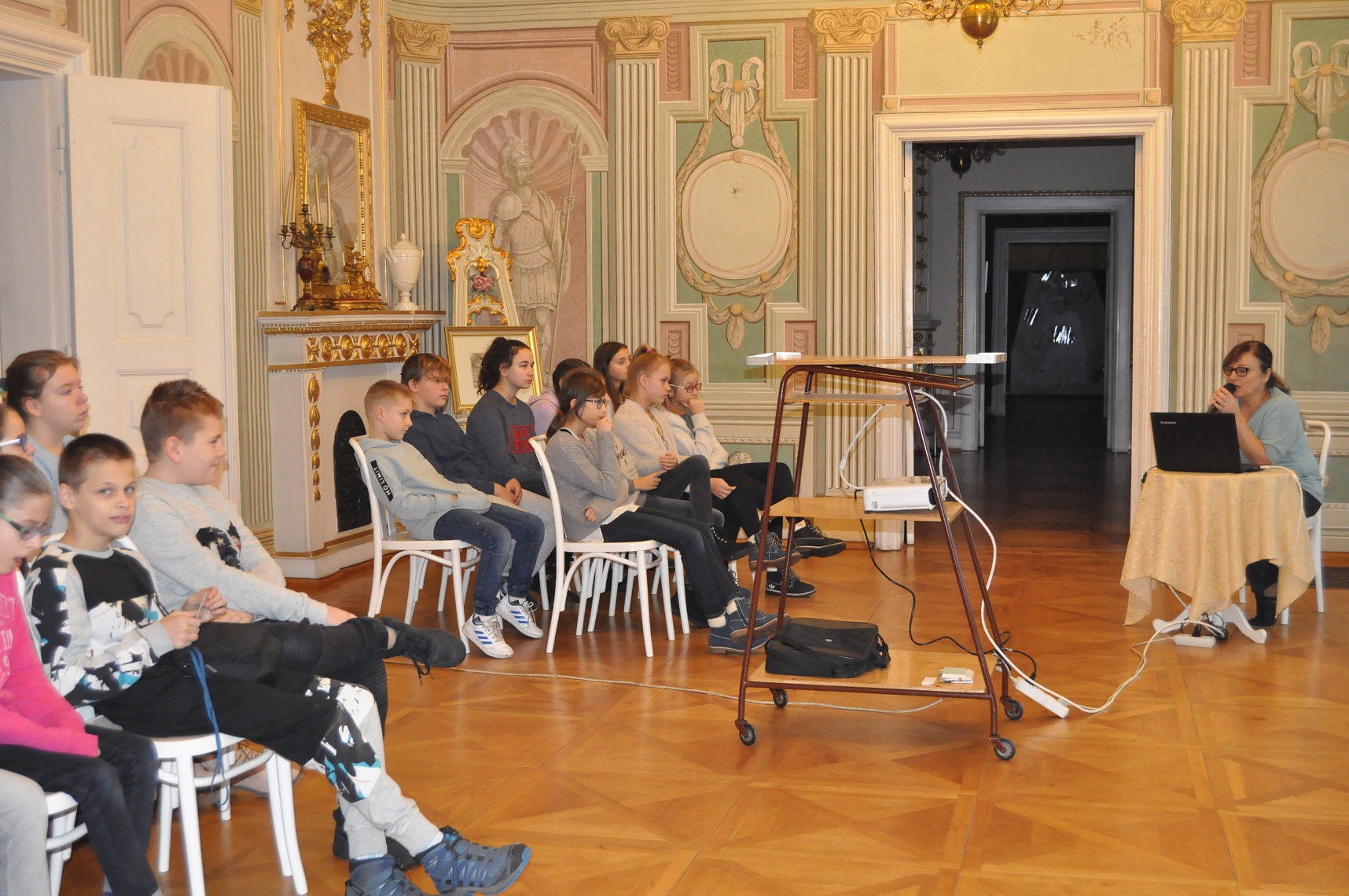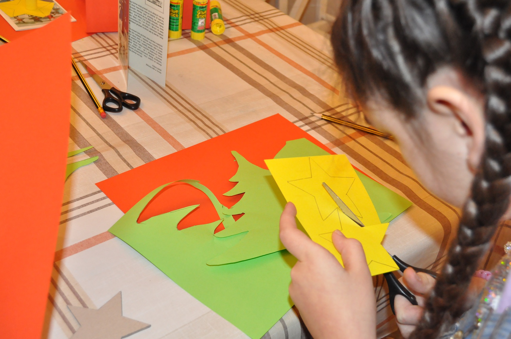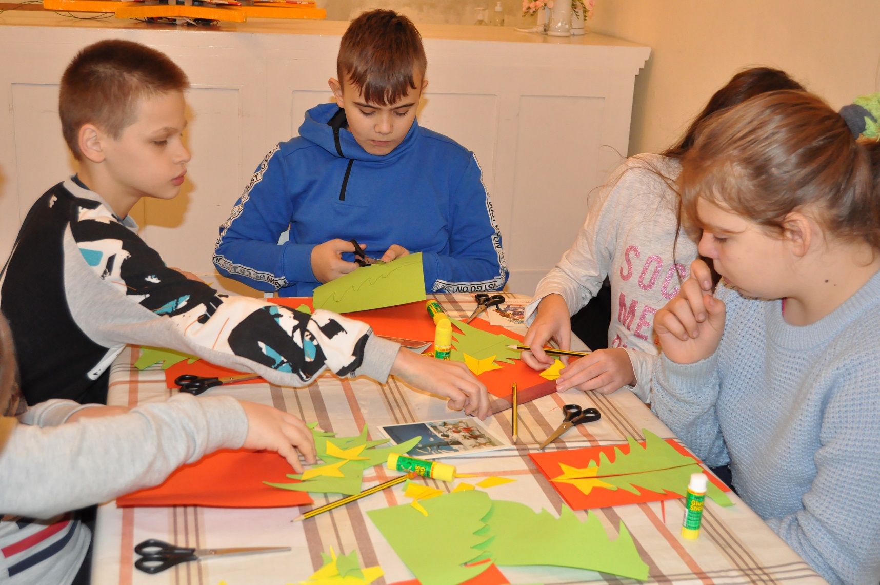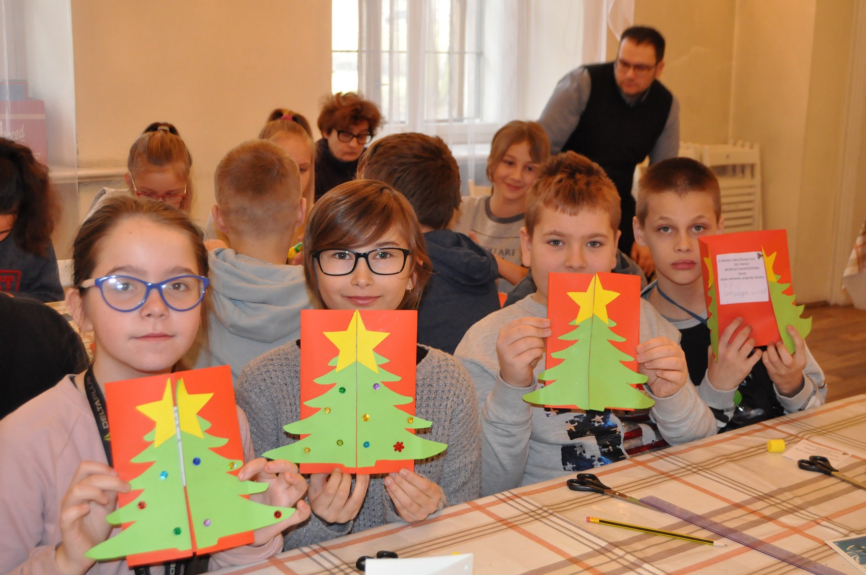 Na dworze szaro, trochę ponuro, a w Pałacu Mieroszewskich bardzo świątecznie, ponieważ nasi uczestnicy warsztatów wykonują piękne pocztówki bożonarodzeniowe.