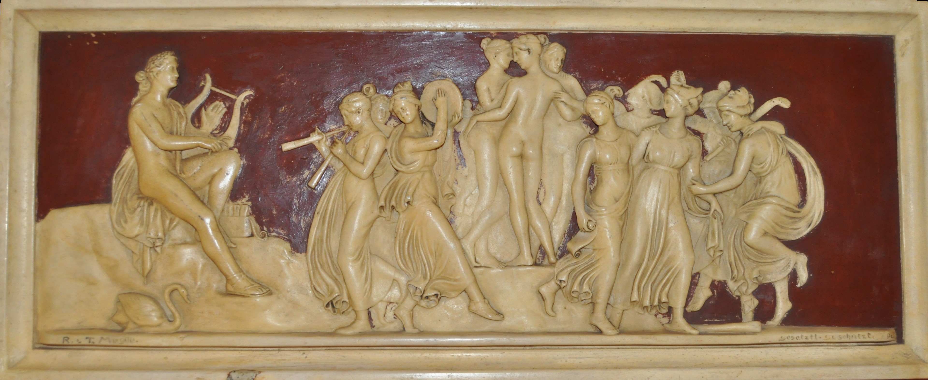 Płaskorzeźba została wykonana na podstawie rzeźby klasycystycznej dłuta Bertela Thorvaldsena (1770-1844), duńskiego rzeźbiarza jednego z czołowych przedstawicieli klasycyzmu. Tę scenę można spotkać w wielu kopiach pt. „Taniec Muz na Helikonie” lub „Apollo i Muzy”. Płaskorzeźba z zasobów Muzeum Zagłębia nosi tytuł „Apollo wśród muz” i jest wykonana w XIX wieku przez nieznanego artystę. Oryginał przedstawienia autorstwa Bertela Thorvaldsena można podziwiać  w Alte Nationalgalerie w Berlinie.