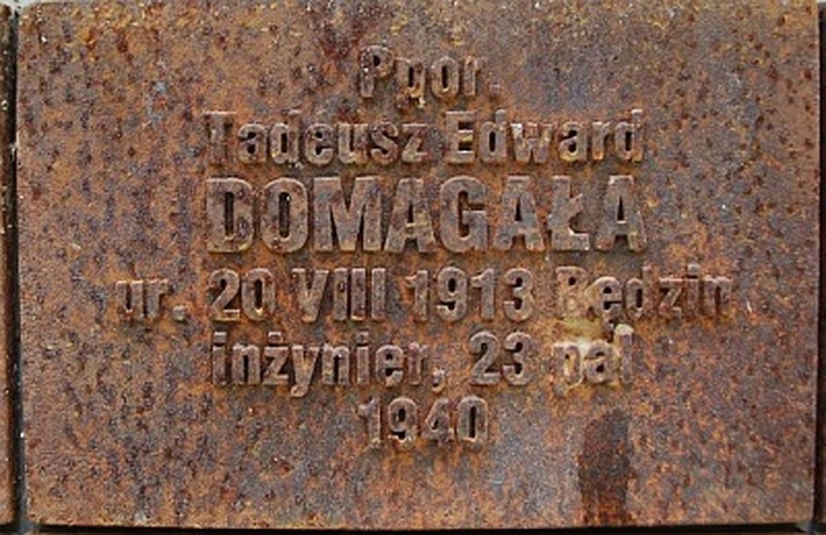 Na rozkaz Stalina ponad 21 tysięcy oficerów polskiego wojska i przedstawicieli innych służb mundurowych zginęło na Wschodzie. Zbrodnia ta pozostawała w Polsce tajemnicą aż do czasów upadku komunizmu w Europie Środkowo – Wschodniej. Współcześnie potocznie określamy ją zbrodnią katyńską, chociaż ofiary tej tragedii były przetrzymywane i poniosły śmierć również w innych miejscowościach na terenie ZSRR i tam zostały pogrzebane. Wśród osób, które zostały wówczas rozstrzelane przez NKWD, znalazły się również osoby związane z Będzinem, zarówno poprzez miejsce urodzenia, pochodzenie, wykształcenie, czy też miejsce sprawowania służby. Byli to zarówno oficerowie Wojska Polskiego, funkcjonariusze Policji Państwowej jak i np. lekarze, prawnicy czy nauczyciele. Spośród nich szerzej znaną postacią, która straciła życie w wyniku egzekucji radzieckich służb, był m.in. Tadeusz Edward Domagała. Urodził się on 20 sierpnia 1913 roku w Będzinie. Był uczniem miejscowej Wyższej Szkoły Realnej (dzisiejszego I LO im. Mikołaja Kopernika), a maturę zdał w Gimnazjum Męskim Stowarzyszenia Rodzicielskiego w Sosnowcu. Studiował na Politechnice Lwowskiej, po czym zawodowo związał się z wojskiem. Ukończył Szkołę Podchorążych Rezerwy Artylerii we Włodzimierzu Wołyńskim, a służył m.in. w 23 Pułku Artylerii Lekkiej w Będzinie. Po wybuchu II wojny światowej w randze podporucznika bronił granic Rzeczypospolitej przed Niemcami, m.in. dowodząc 6 baterią 23 PAL. Został ranny w starciu w okolicach Pacanowa, by następnie znaleźć się w szpitalu w Kowlu. Po wkroczeniu Armii Czerwonej został osadzony w obozie jenieckim w Kozielsku. Z tego miejsca Tadeusz Edward Domagała został wraz z ponad 600 innymi oficerami wywieziony i rozstrzelany 7 kwietnia 1940 roku. Była to jedna z pierwszych grup, stanowiących ofiary zbrodni katyńskiej. Zwłoki T. E. Domagały zidentyfikowano podczas ekshumacji w lesie katyńskim, wiosną 1943 roku. Pośmiertnie został on awansowany do stopnia porucznika. Dzięki odnalezionemu kalendarzykowi z jego osobistymi zapiskami możemy dziś odtworzyć niektóre fakty z wojny obronnej Polski we wrześniu 1939 roku oraz sowieckiej niewoli. W 2010 roku uczczono go, sadząc Dąb Pamięci na placu Kardynała Lustigera w Będzinie, w ramach ogólnopolskiej akcji „Katyń… ocalić od zapomnienia”.