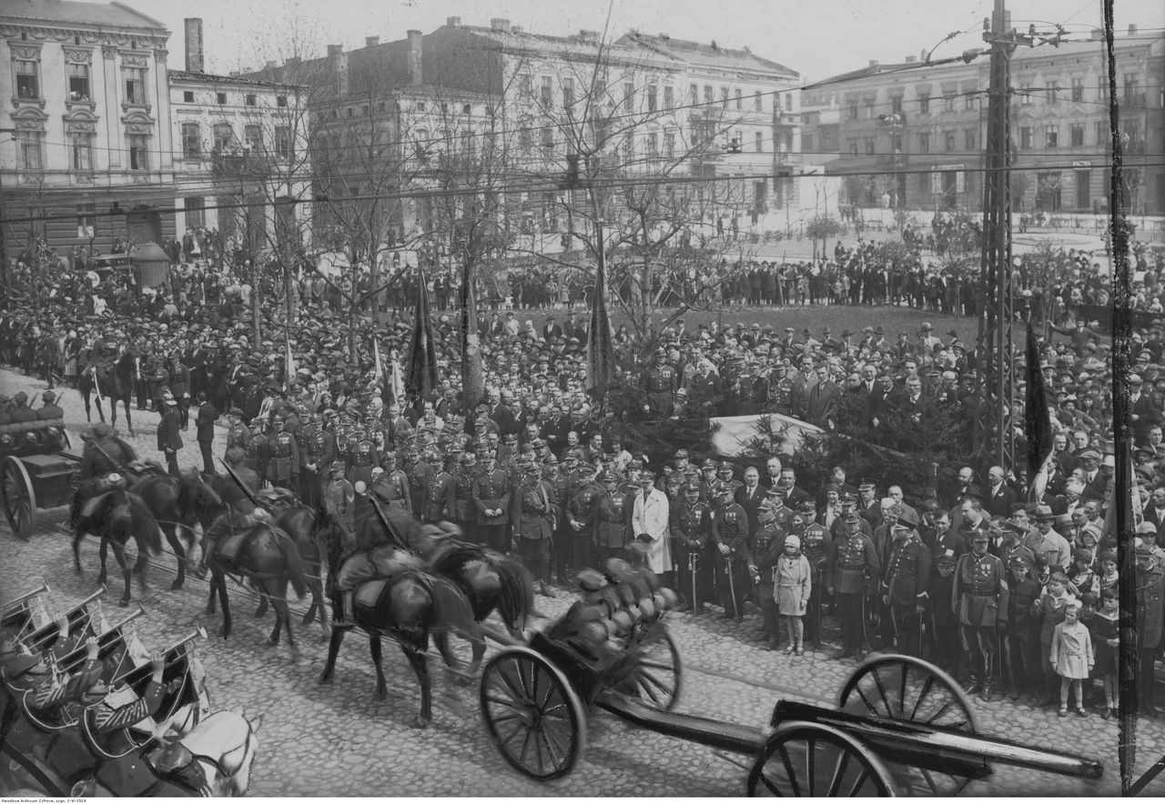Zdjęcie poniżej przedstawia defiladę na placu 3 maja w Będzinie w okresie międzywojennym.