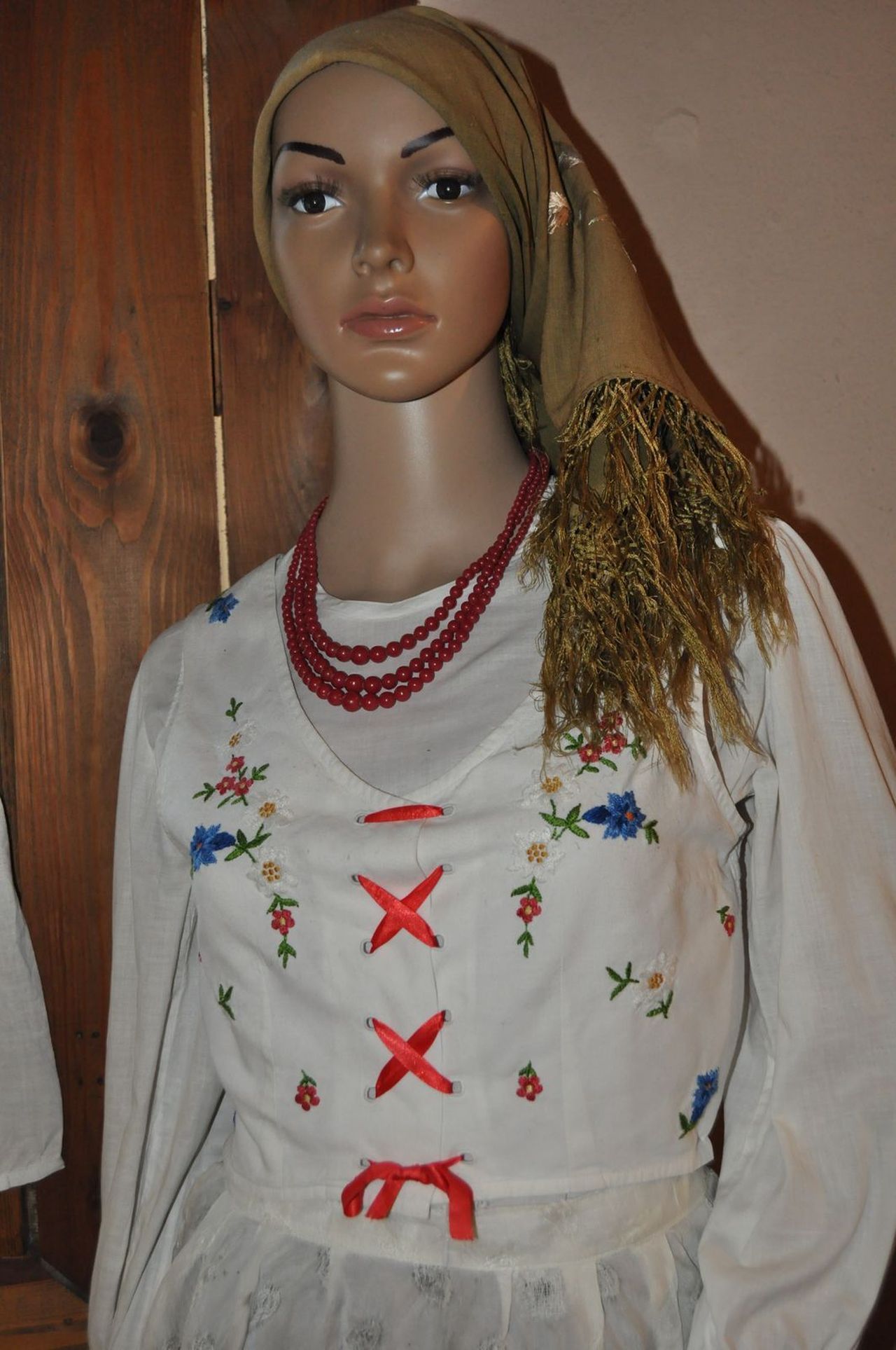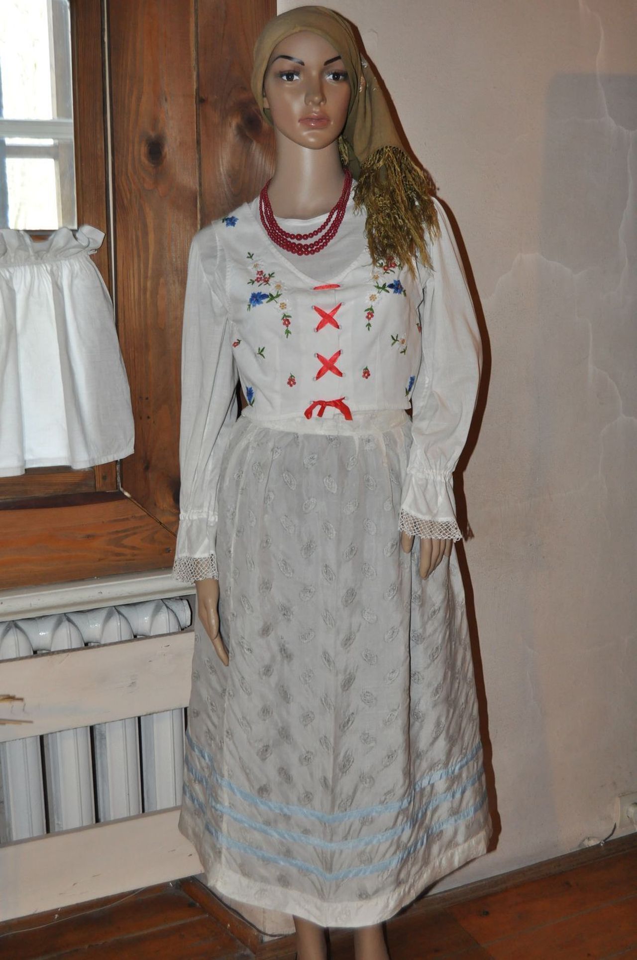 Koszule o kroju poncho miały długie rękawy ujęte w mankiety, pod pachami „ćwikle” (kwadratowe kliny) a przy szyi wąską oszewkę. Dolną część lnianej koszuli, tzw. „nadołek” zakrywała spódnica, dlatego uszyty był najczęściej z gorszego materiału. Ozdobą stroju była lekko zmarszczona kreza z tiulowej bądź klockowej koronki i korale, na które nie każda kobieta mogła sobie pozwolić. Mniej zamożne wieśniaczki, podobnie jak nasza „wystawowa modelka” na krezę zakładały sznury sztucznych korali. Na koszuli noszono płócienną halkę, ozdobioną dołem falbaną, haftem, bądź koronkową wstawką oraz stanik z cienkiego płótna, o głębokim dekolcie, dopasowany do figury, ze sznurowaniem z przodu. Stanowił on zewnętrzną cześć garderoby, dlatego wyszywano go kolorowymi nićmi w drobny ornament roślinny. W zbiorach muzeum zachował się jedyny znany okaz takiego stanika ze Strzemieszyc Małych z ok.1900 r. Elegantki ubierały pod koszule obcisłe gorsety dla podkreślenia figury.