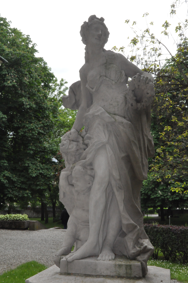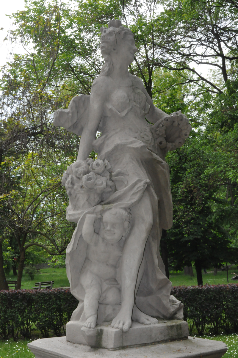 Drugie przedstawienie to „Popiersie Flory” przyozdobione różami. Wizerunek młodej, rozmarzonej dziewczyny wykonany w białym marmurze dłuta włoskiego artysty Gelindo Monzini został stworzony w mediolańskiej pracowni z wielką dbałością o szczegóły ok. 1877 r. Natomiast w naszym parku, wśród roślinności, na postumencie króluje późno-barokowa rzeźba Flory (początek XVIII w.) wykonana w piaskowcu. Piękna bogini w teatralnej pozie z różami w koszyczku i z wiankiem w dłoni, w towarzystwie putta zwraca uwagę spacerowiczów. Wpatrując się w modelunek twarzy rzeźby ogrodowej można odnieść wrażenie, że Flora chce coś przekazać przechodniowi. W tym momencie skojarzenie „biegnie” ku fragmentowi książki, gdzie swoją historię – słowami Owidiusza - opowiada Flora.