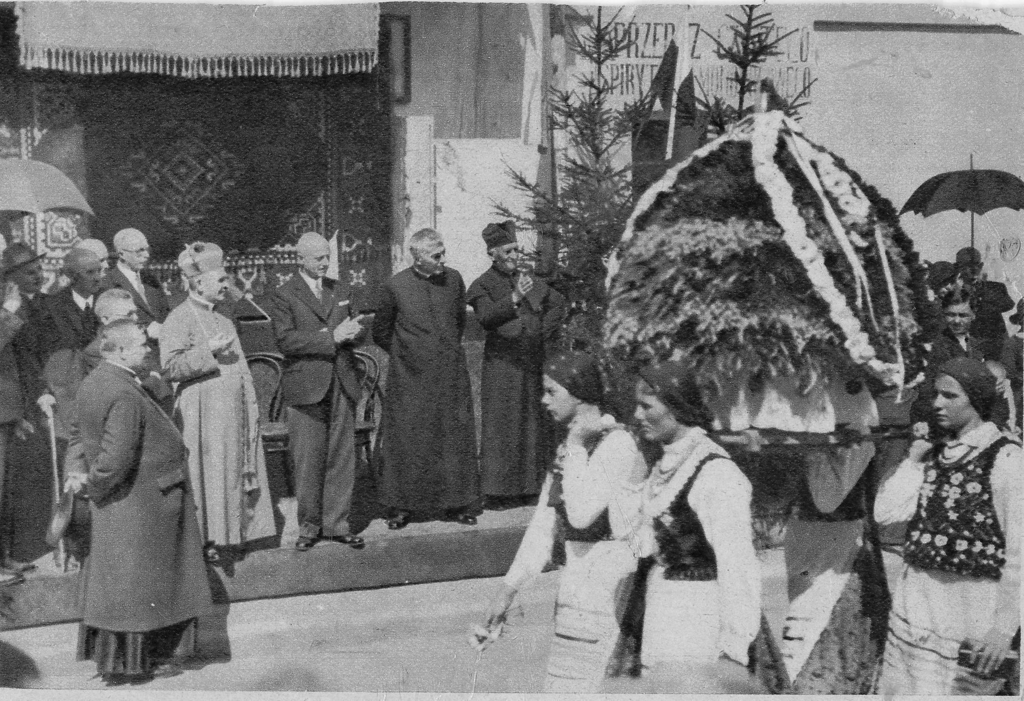 Defilada żeńców przed starostwem. Na podniesieniu stoją J. E. ks. biskup tarnowski, dr Lisowski,