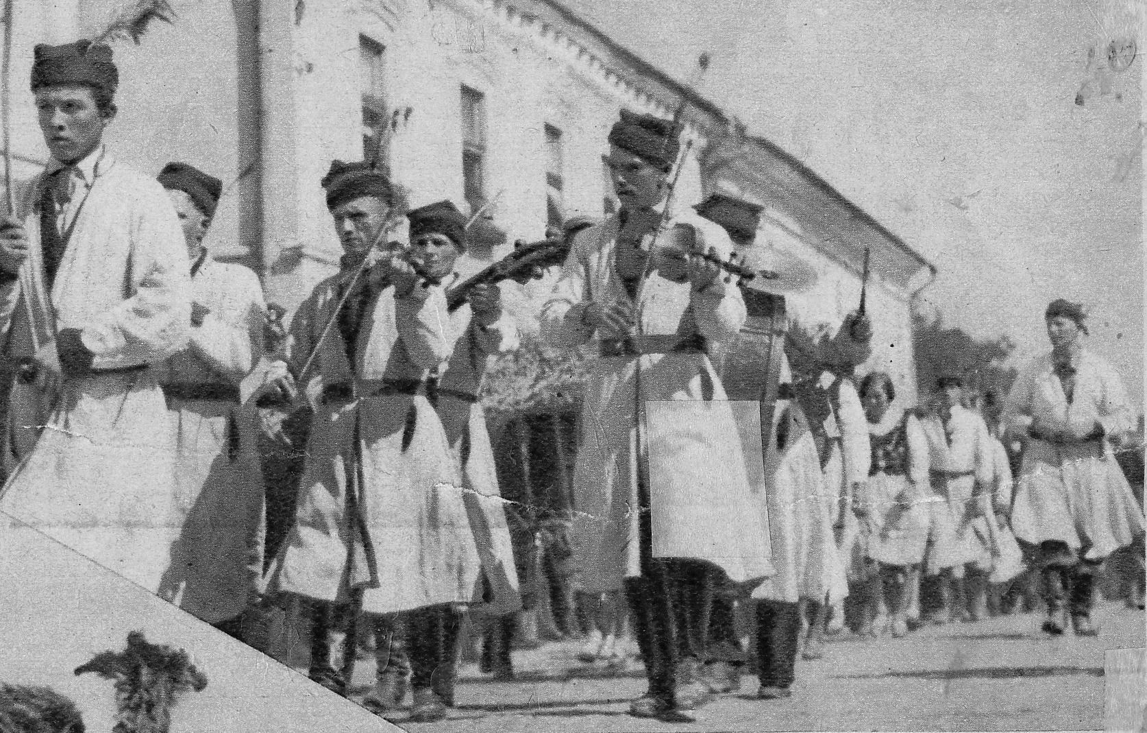 Kapela włościan w pochodzie dożynkowym.