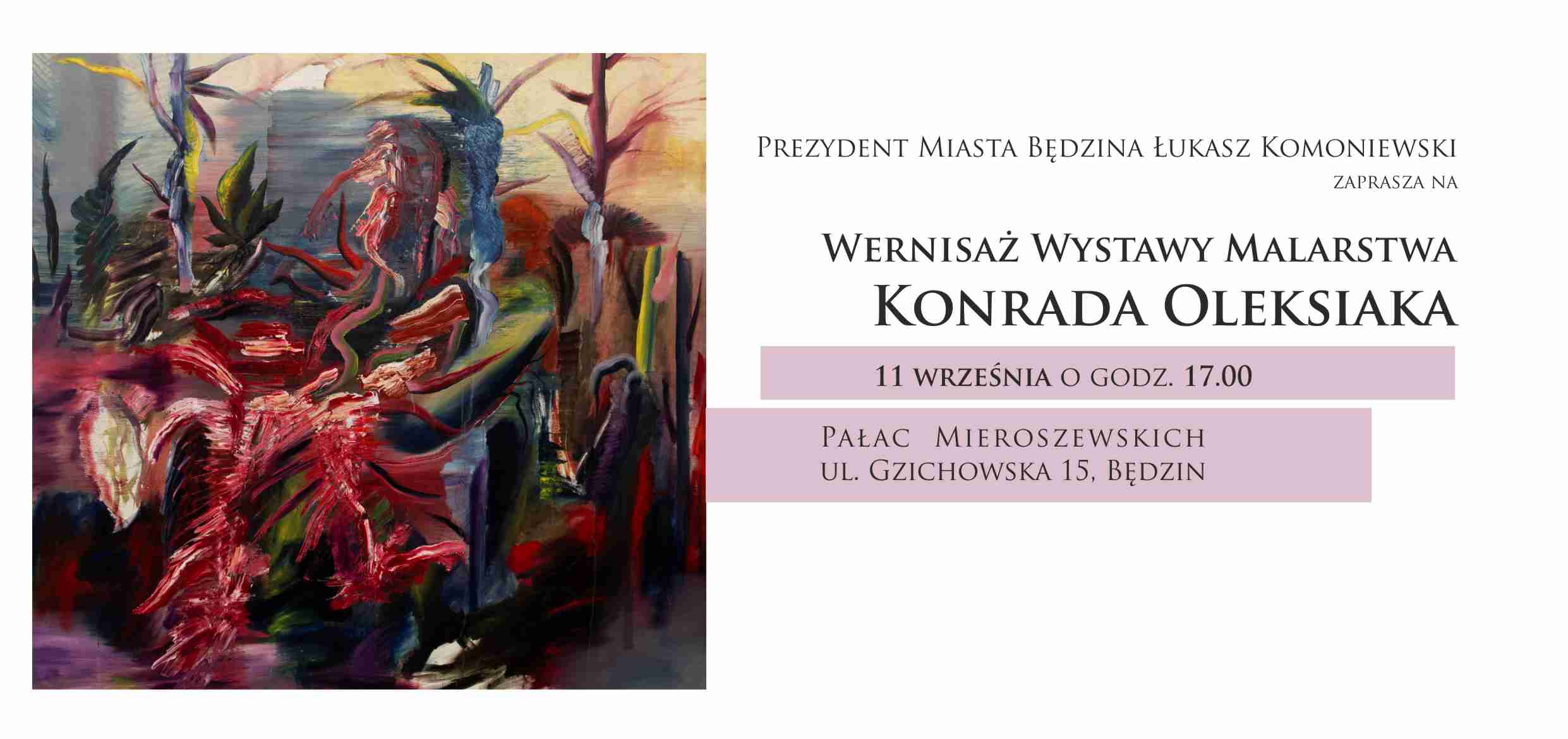 11 września 2020 roku o godzinie 17.00 odbędzie się wernisaż wystawy malarstwa Pana Konrada Oleksiaka. Wystawę będzie można oglądać w Pałacu Mieroszewskich przez miesiąc, do 11 października.