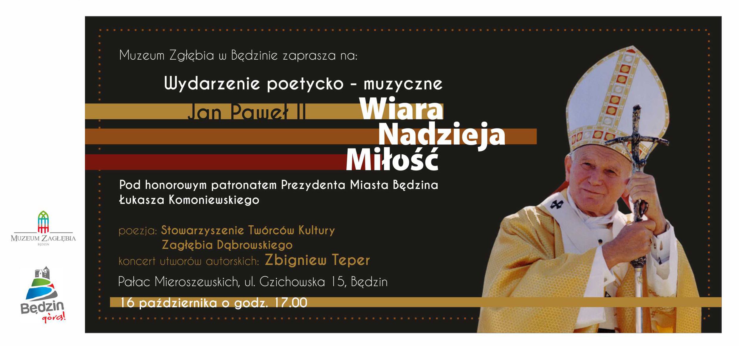 Zapraszamy bardzo serdecznie na wieczór poetycko-muzyczny "Jan Paweł II Wiara-Nadzieja-Miłość", który odbędzie się 16 października o godzinie 17.00 w Pałacu Mieroszewskich. Wydarzenie jest organizowane z okazji rocznicy 100-lecia urodzin Papieża.