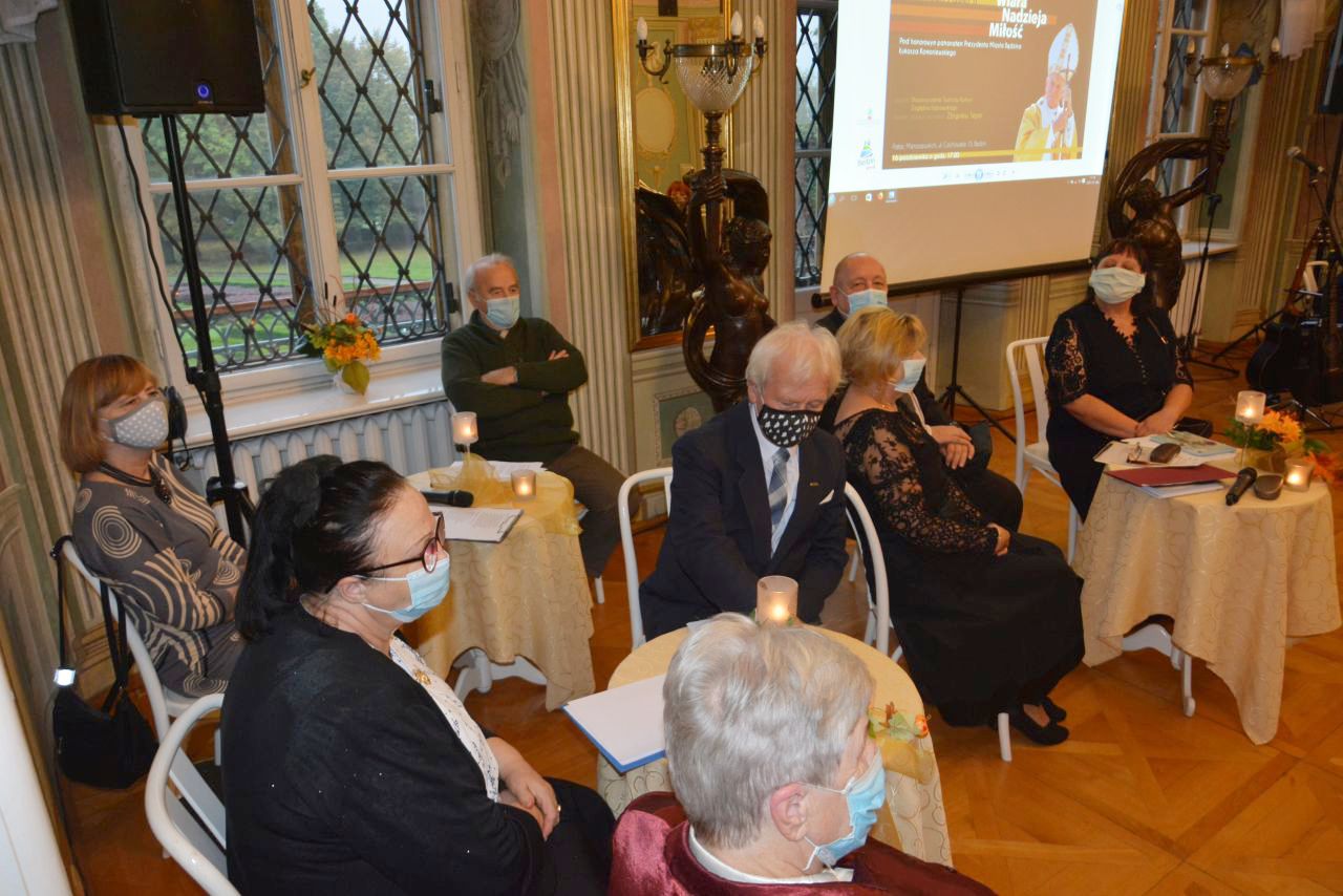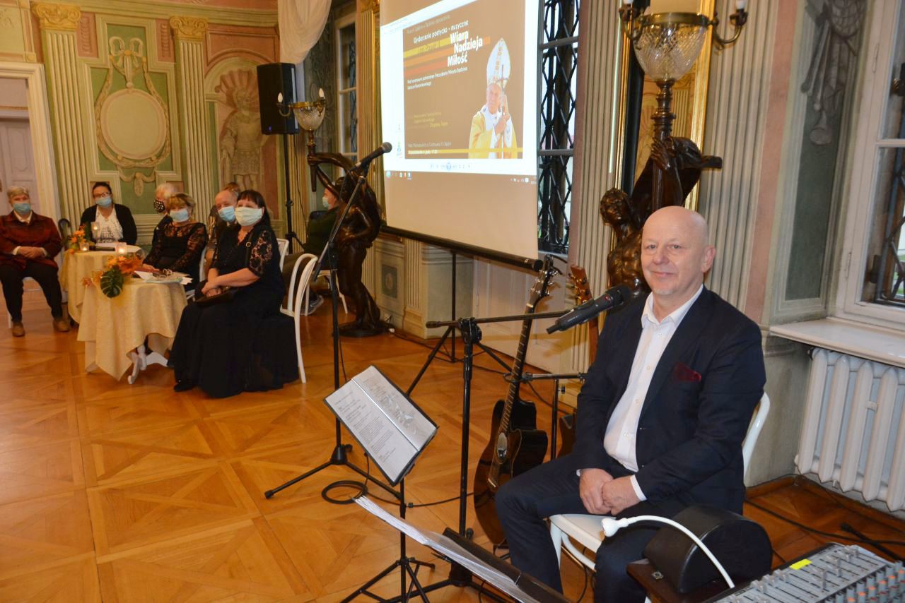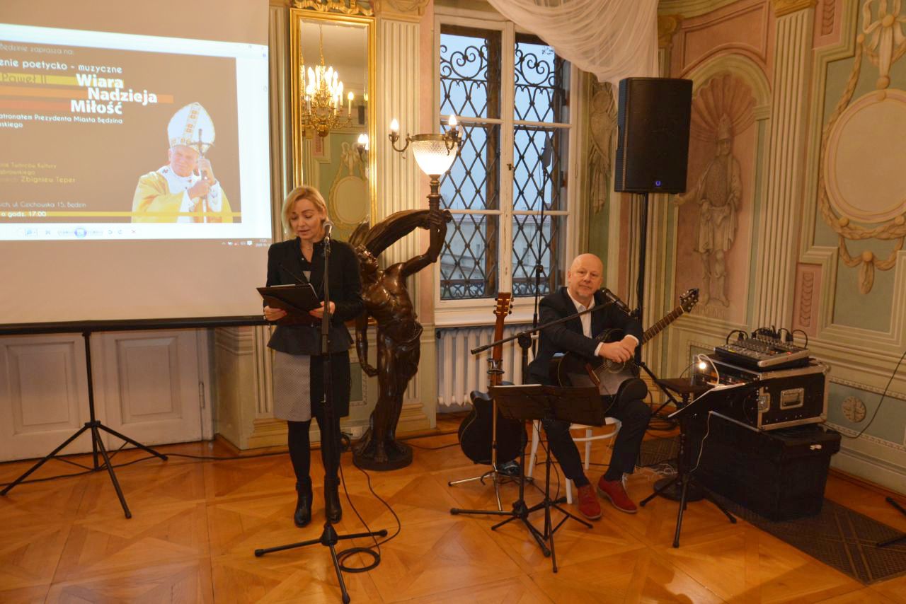 Dlatego w dniu owej rocznicy w Pałacu Mieroszewskich miało miejsce wydarzenie kulturalno-artystyczne, zorganizowane w roku, w którym minęła 100 rocznica urodzin Świętego naszych czasów. Poeci Stowarzyszenia Twórców Kultury Zagłębia Dąbrowskiego w składzie Krystyna Borkowska, Jolanta Leks – Bugajska, Zofia Cencek, Maria Herman, Wanda Halina Kusztyb, Jerzy Georg Lewestam, Teresa Orłowska i Jolanta Wychowaniec zaprezentowali swoje wiersze o tematyce poświęconej Ojcu Świętemu, a Zbigniew Teper, poeta, pieśniarz i bard Zagłębia Dąbrowskiego, uświetnił dzisiejszy wieczór koncertem utworów z własnego repertuaru.