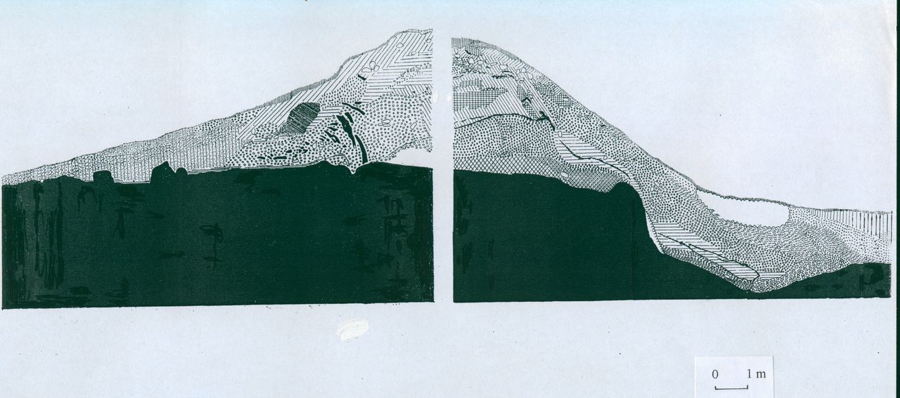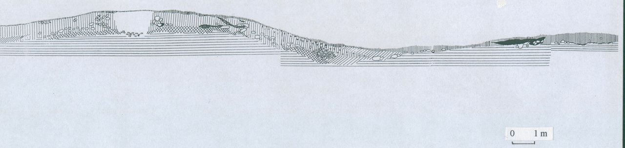1. Przekrój przez wał i fosę wewnętrznego systemu obronnego z epoki plemiennej. W profilu usypiska widoczne rozrzucone kamienne wzmocnienia u podstawy i ślady spaleniska ponad fosą.
