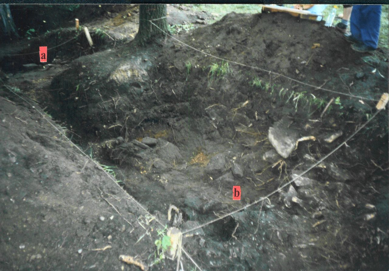 2. Kulminacja rozsypiska wału wewnętrznego (a i b – rozrzucone kamienne wzmocnienia.