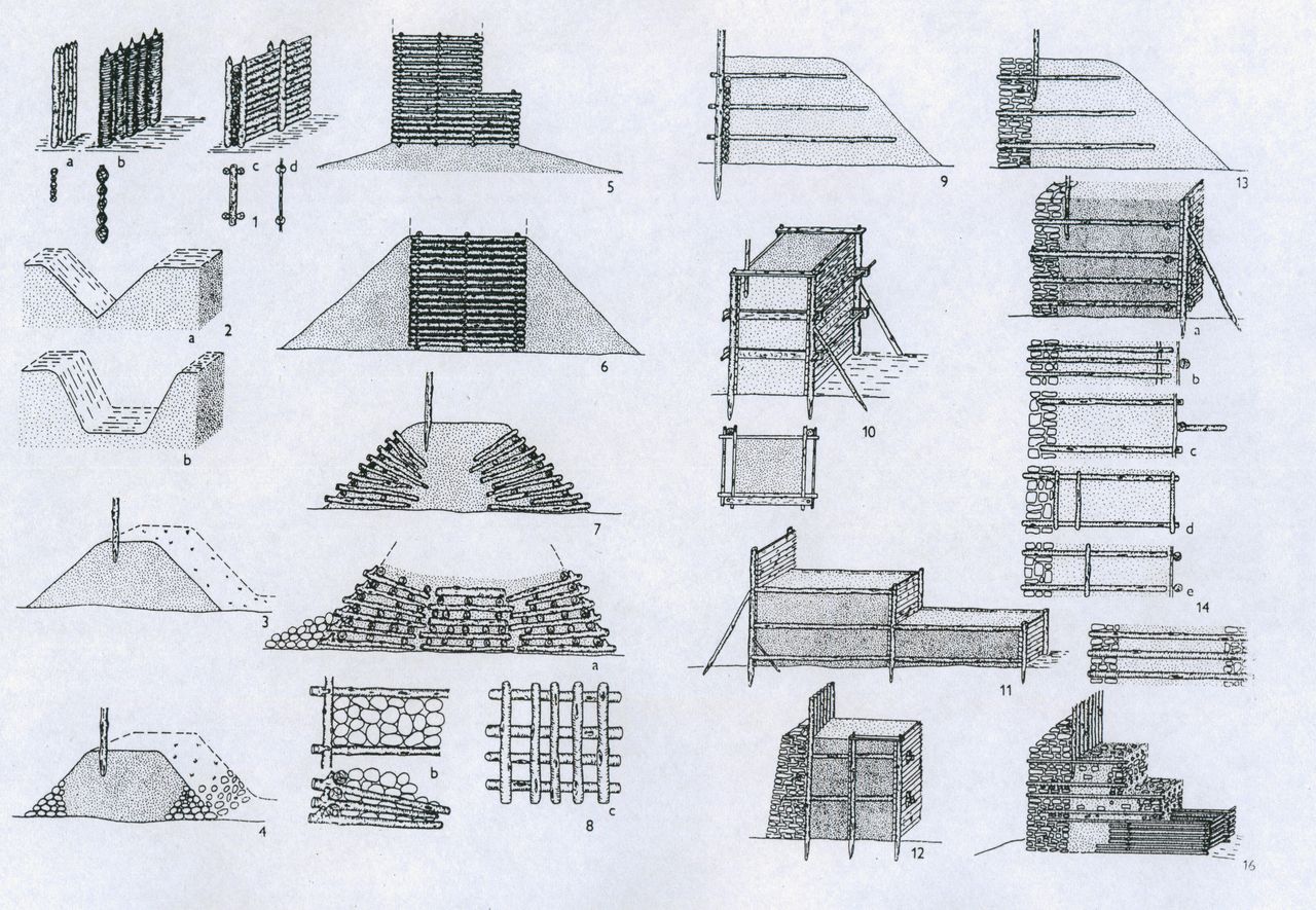 5. Wały wielkomorawskie wg. R. Prochàzki. Konstrukcji wału wewnętrznego grodu plemiennego na Górze Zamkowej odpowiada wariant 4.