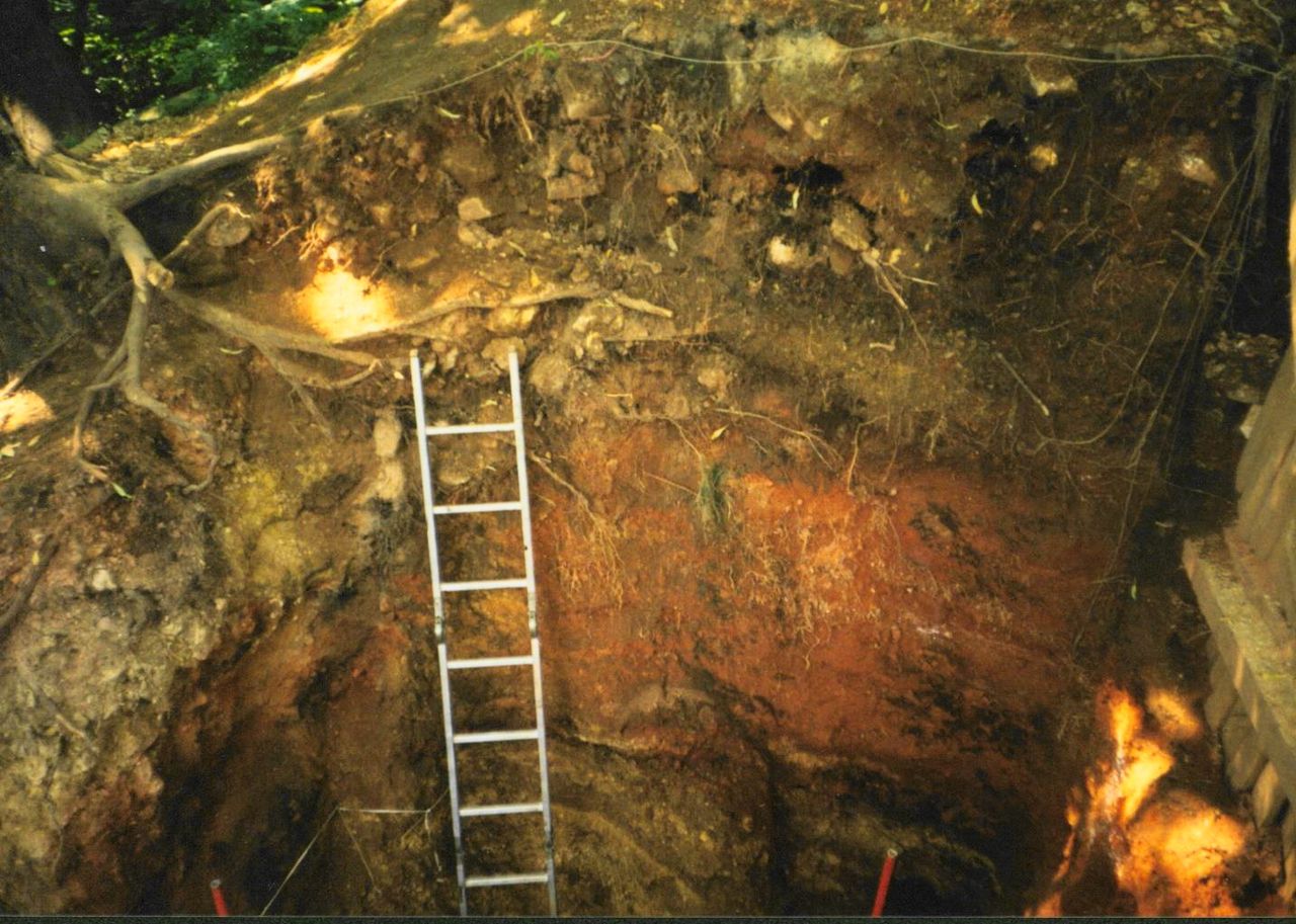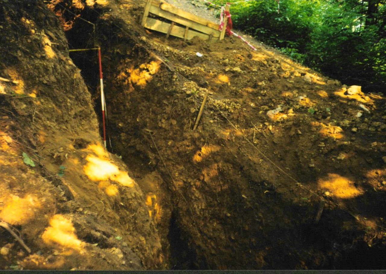 6. Profil wału zewnętrznego grodu posadowionego na kulminacji Góry Zamkowej. W usypisku od strony fosy widoczne ciemne, opadające pasmo – szczątki drewnianego zasieku po spaleniu.