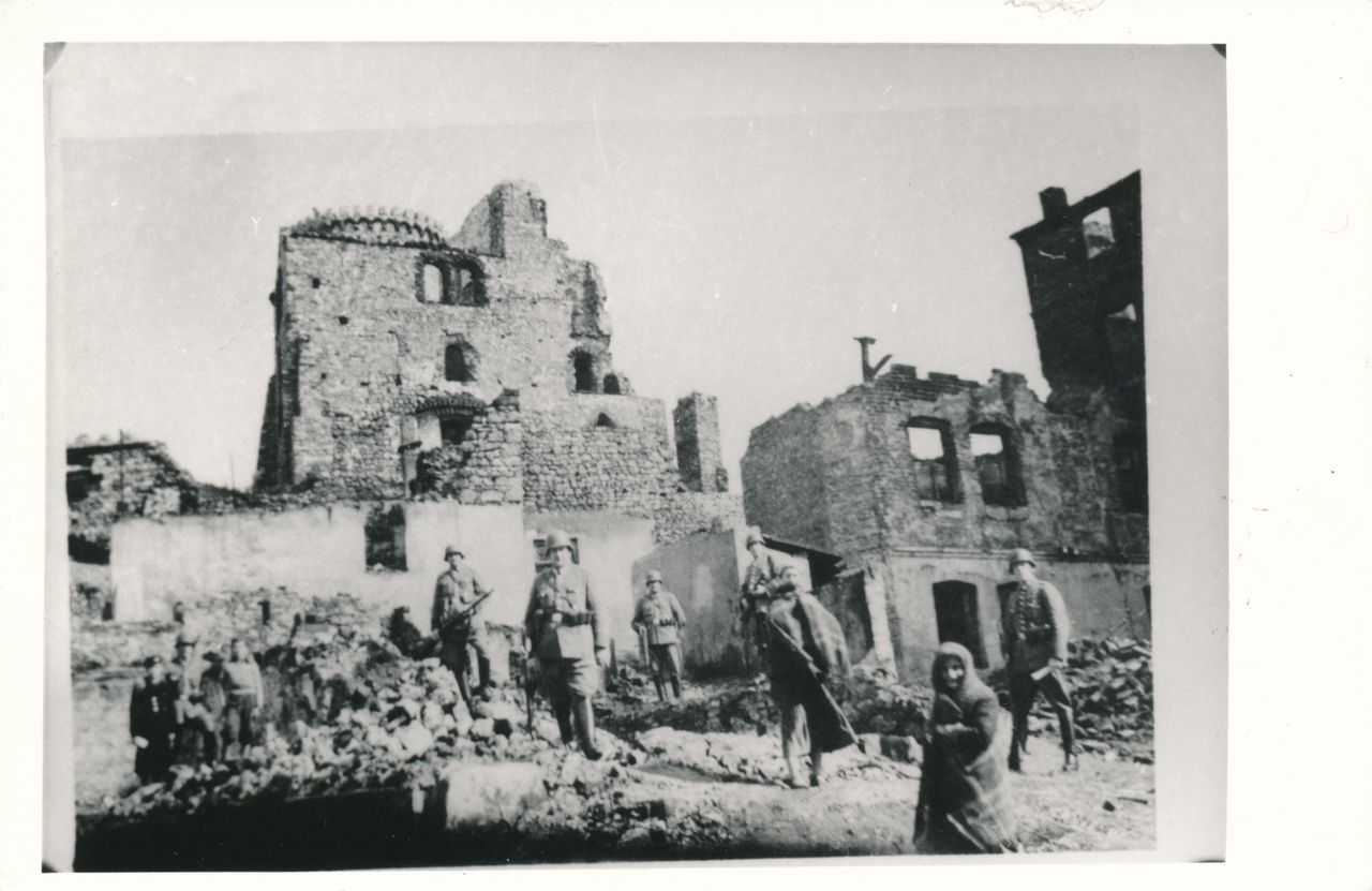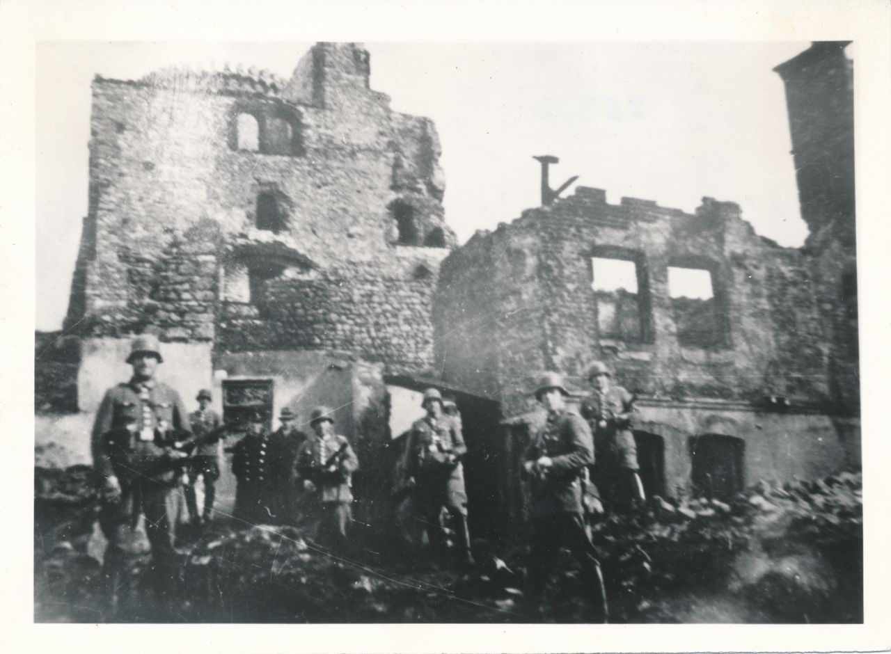9) Ruiny zamku w czasie okupacji hitlerowskiej. Zdjęcie wykonano w pobliżu miejsca, w którym znajdowała się spalona przez Niemców we wrześniu 1939 r. synagoga będzińska.