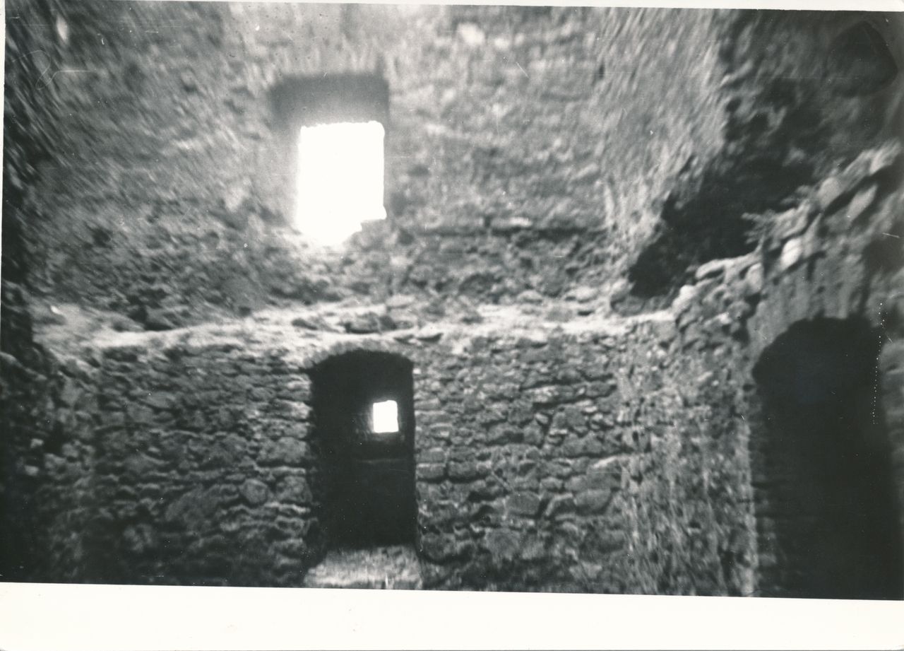 5) Zamek w Będzinie. Widok od strony południowo-wschodniej. W wieży czworobocznej zachowana ściana zachodnia, północna i nieduże partie ściany wschodniej.
