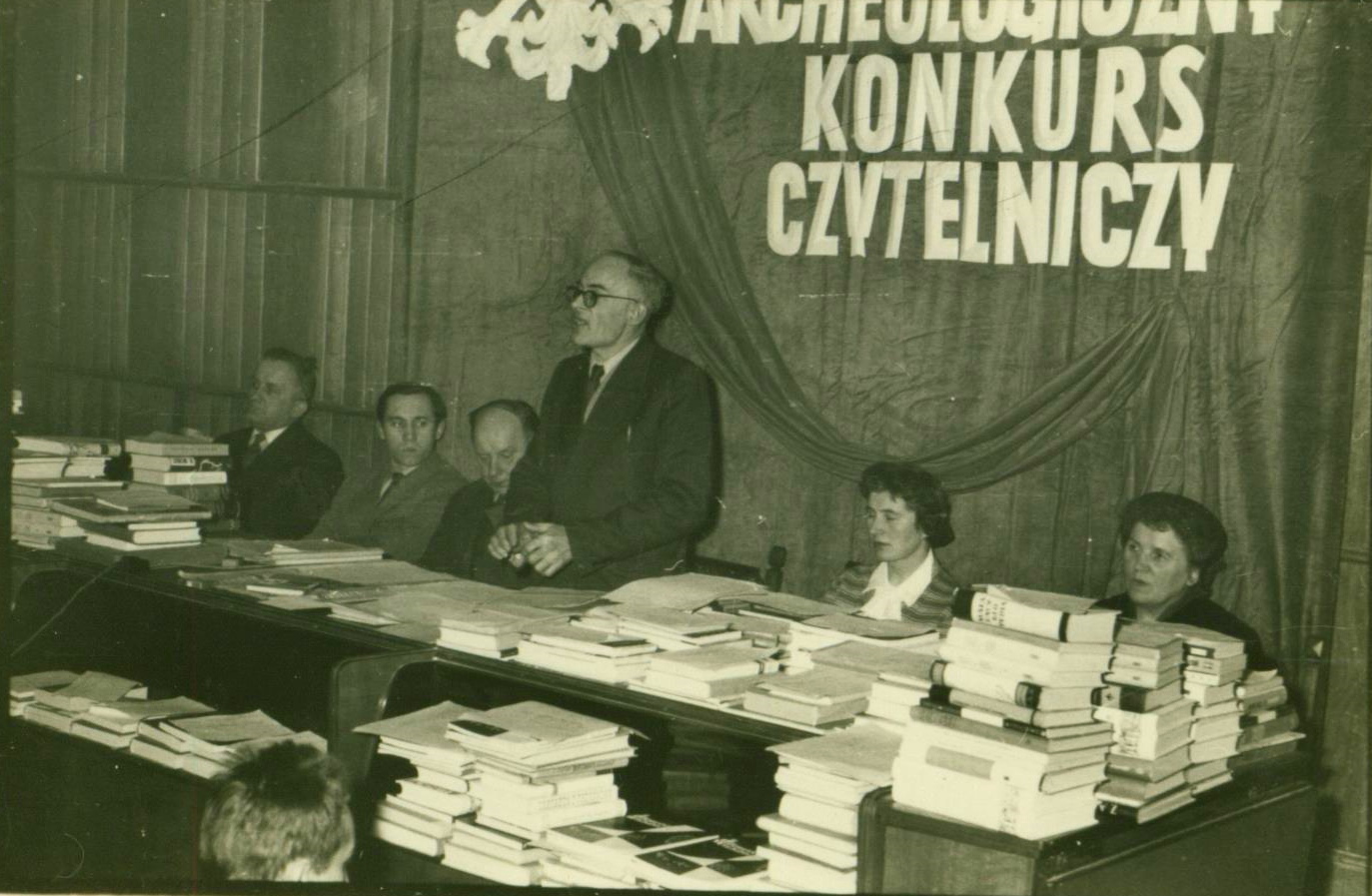 Podsumowanie archeologicznego konkursu czytelniczego w siedzibie Biblioteki Miejskiej w Będzinie przez L. Balcerowskiego, 1961 rok