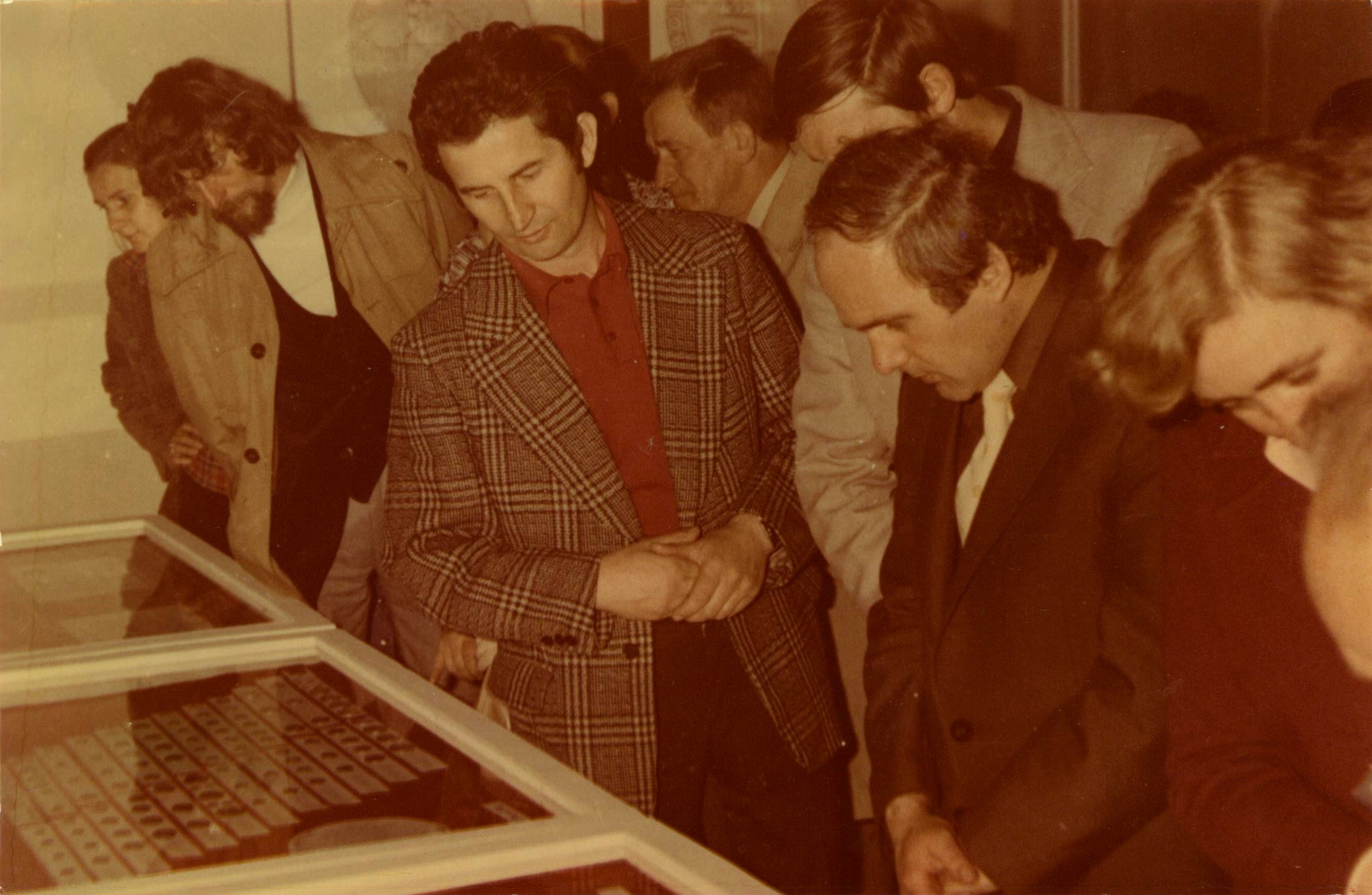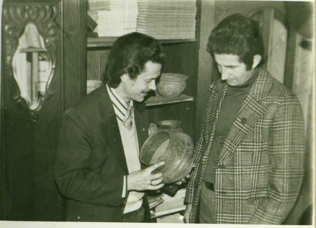 Prezes sekcji numizmatycznej W. R. Pustułka i jej sekretarz J. Starczynowski podczas oględzin eksponatów archeologicznych, 1976 rok