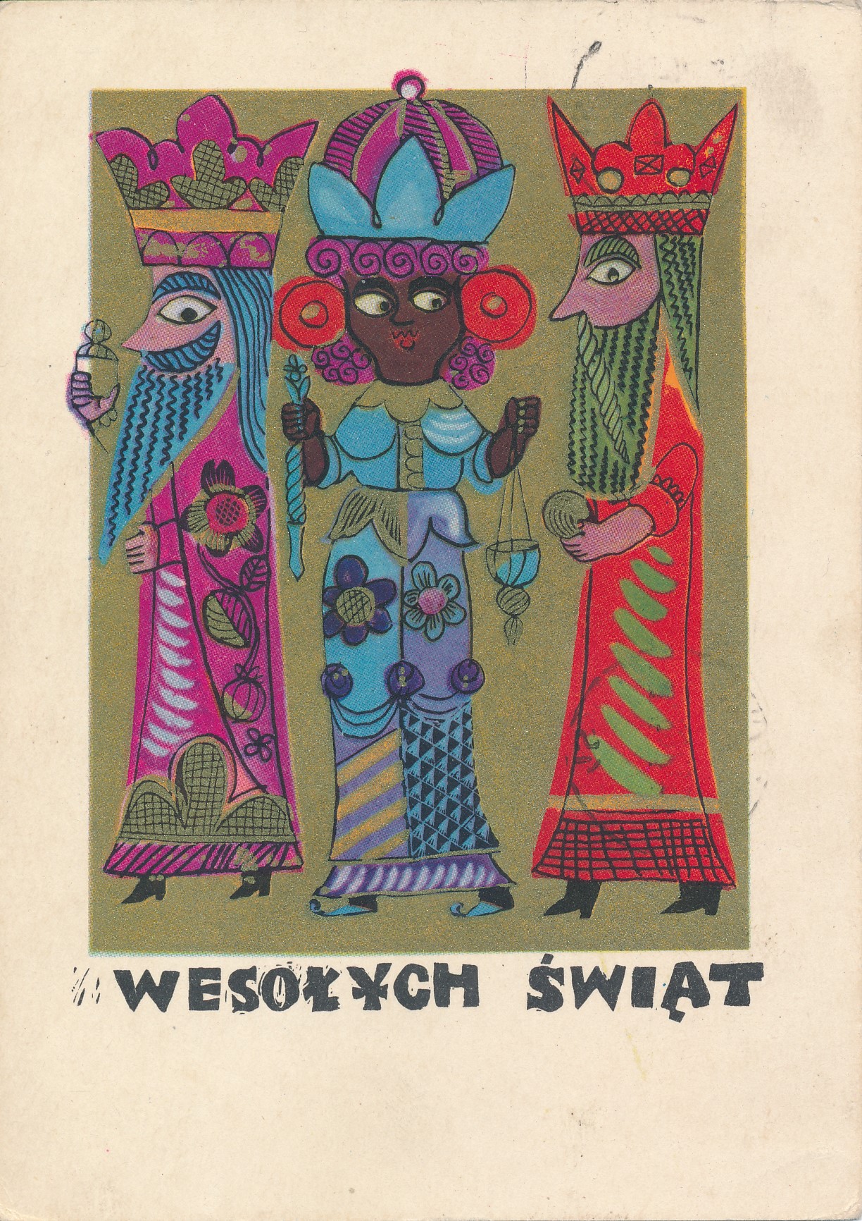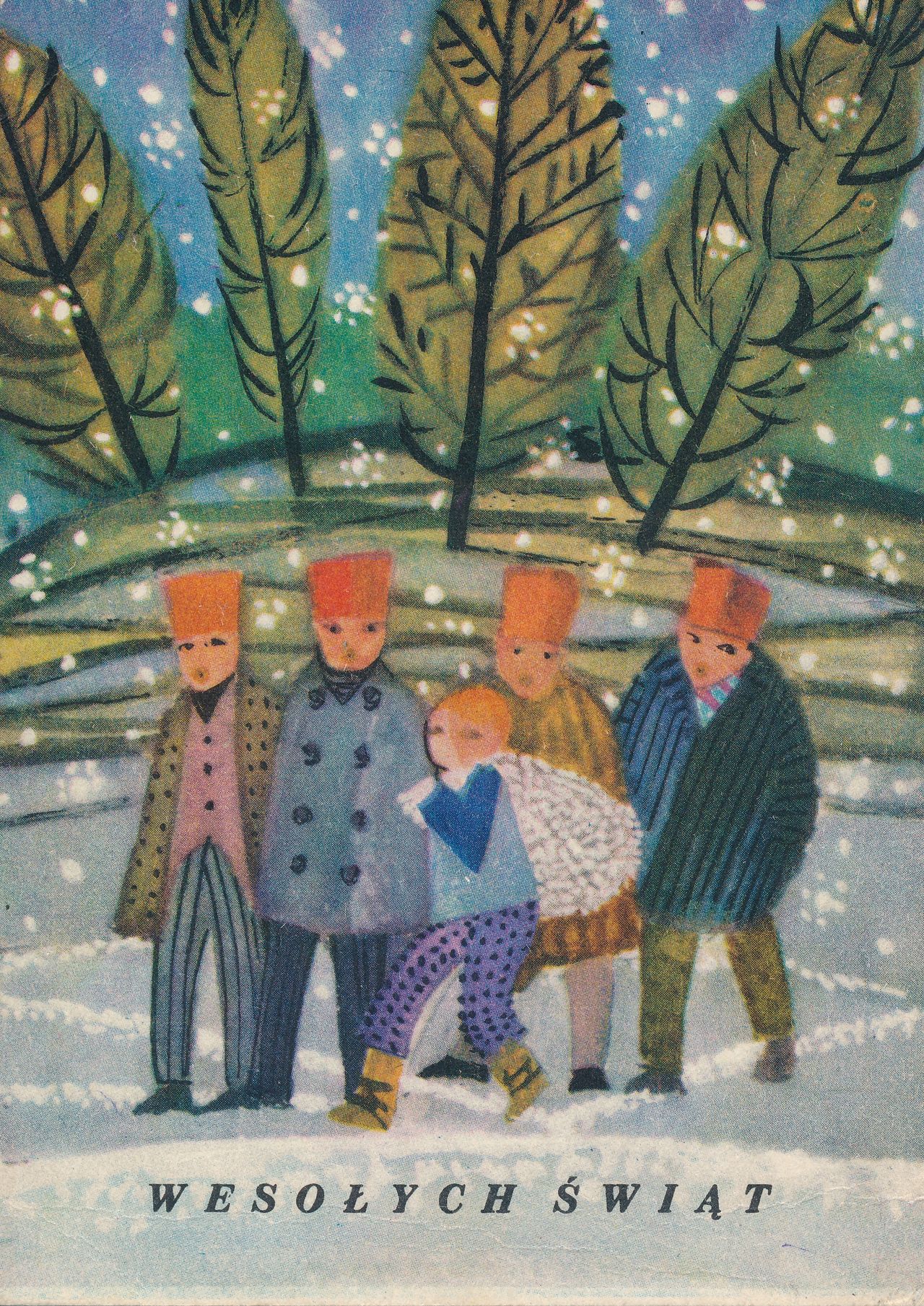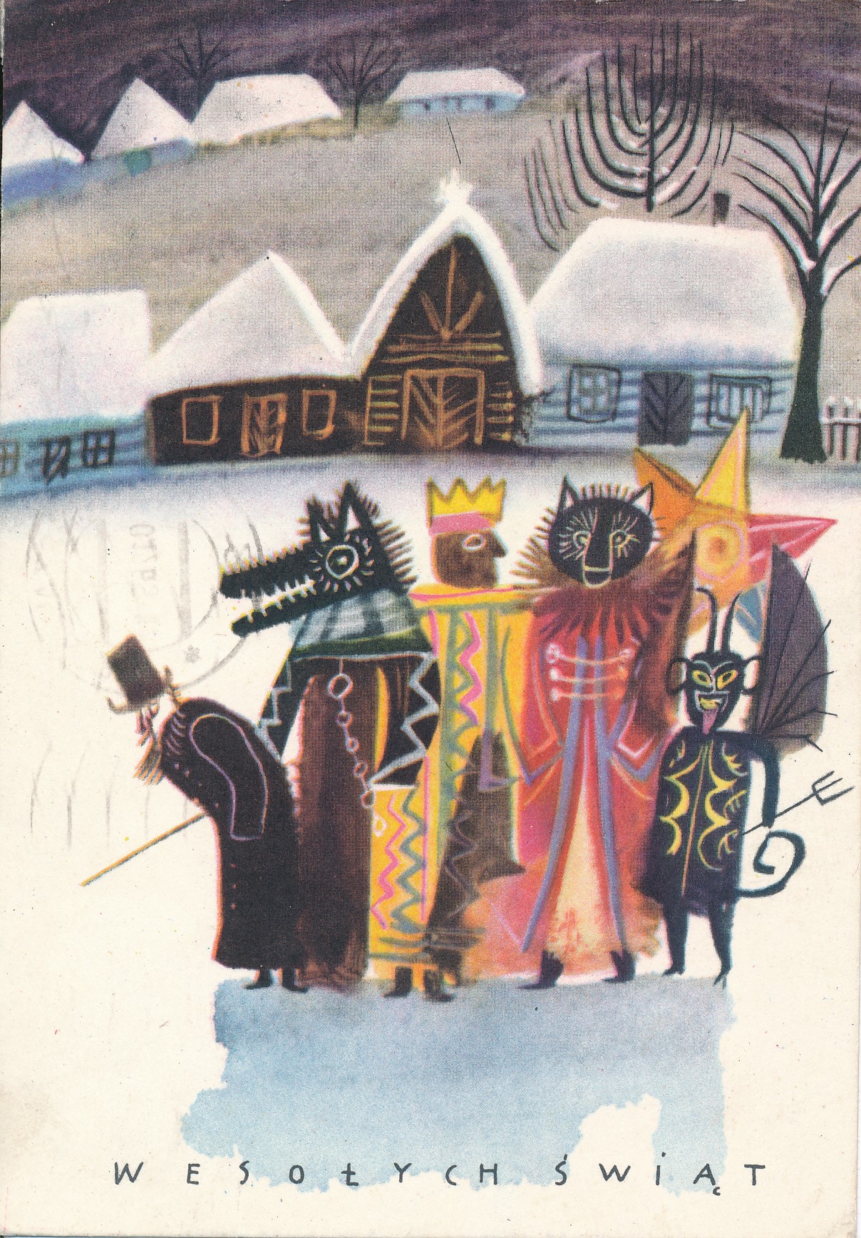 13 Karta świąteczna, projekt: Józef Wilkoń, lata 60. XX w., ze zbiorów Biblioteki Uniwersytetu Mikołaja Kopernika w Toruniu.