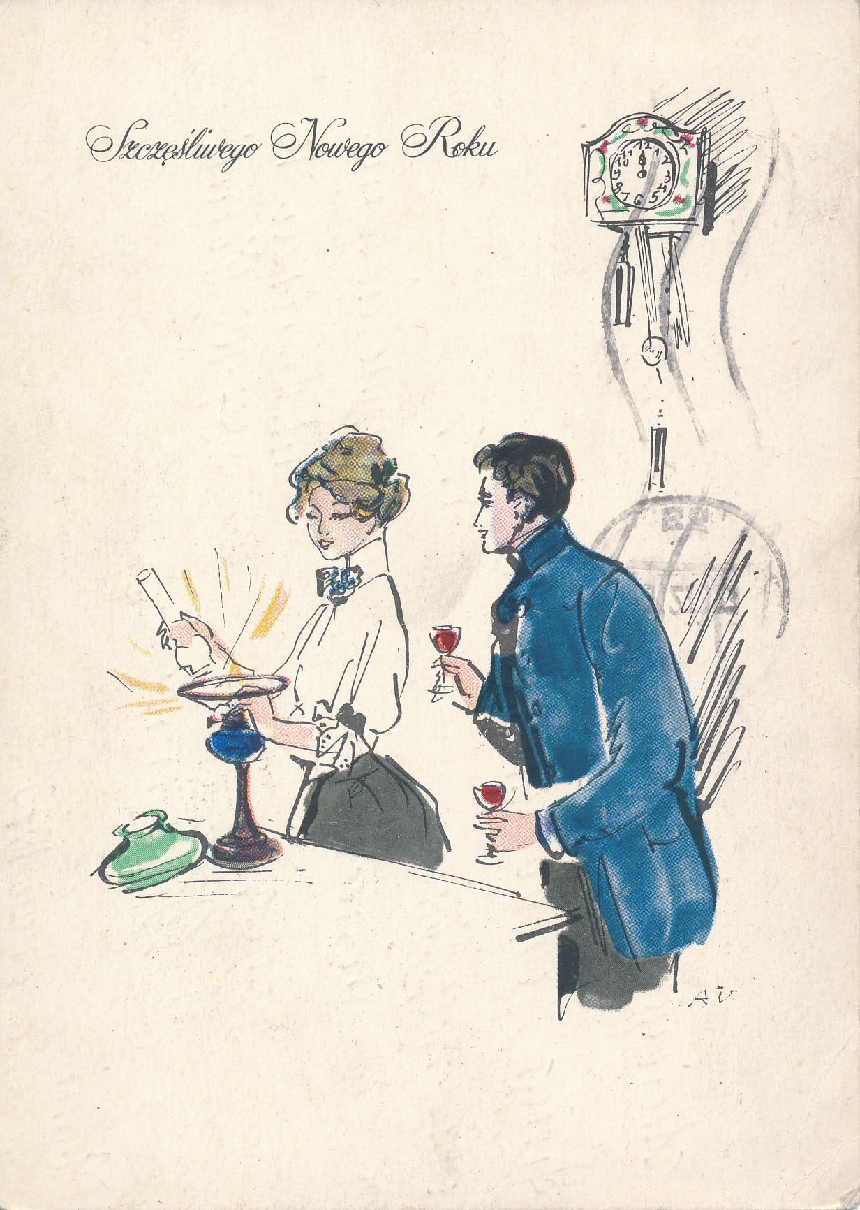 5 Karta noworoczna, projekt: Antoni Uniechowski, lata 60. XX w., ze zbiorów Biblioteki Uniwersytetu Mikołaja Kopernika w Toruniu.