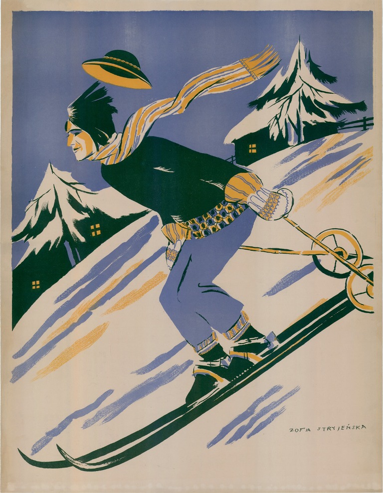 Plakat „Zawody Narciarskie o Mistrzostwo Zakopanego”, ok. 1921-1927 r. Proj. Zofia Stryjeńska, ze zbiorów Muzeum Tatrzańskiego im. dra Tytusa Chałubińskiego w Zakopanem, plakat prezentowany na wystawie