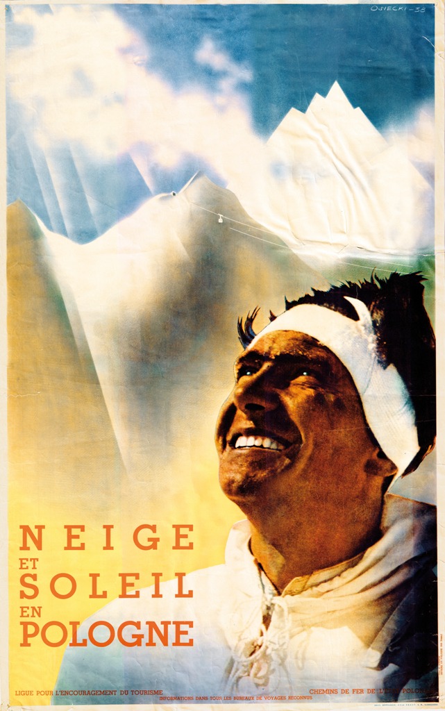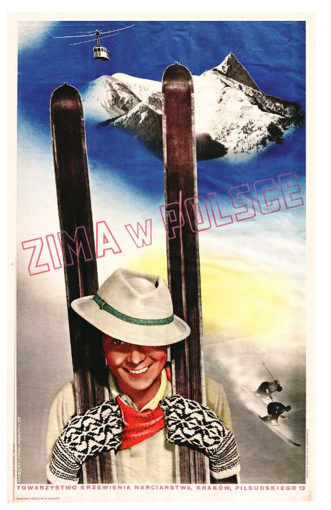 Plakat „Neige et soleil en Pologne”, 1938 r. Proj. Stefan Osiecki; Fot. Roman Serafin, ze zbiorów Muzeum Tatrzańskiego im. dra Tytusa Chałubińskiego w Zakopanem, plakat prezentowany na wystawie