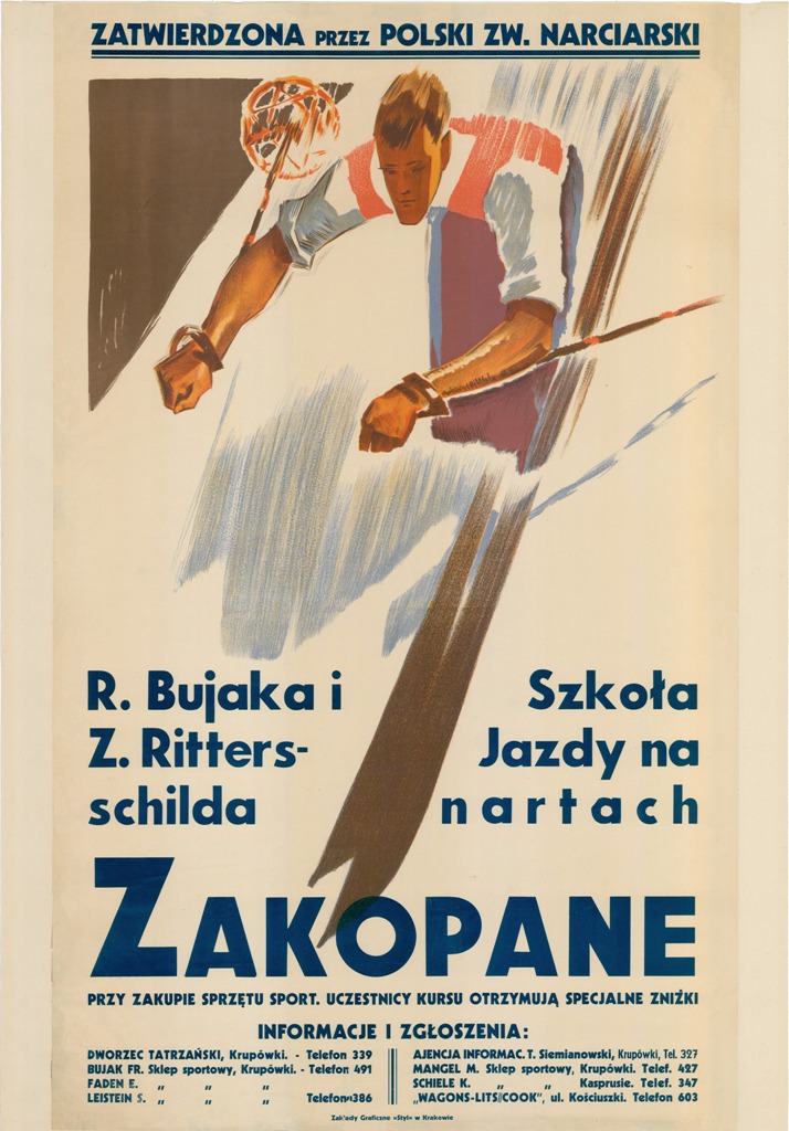 Plakat „Szkoła jazdy na nartach R. Bujaka i Z. Ritterschilda Zakopane”, lata 30. XX w. Proj. N.N., ze zbiorów Muzeum Tatrzańskiego im. dra Tytusa Chałubińskiego w Zakopanem, plakat prezentowany na wystawie