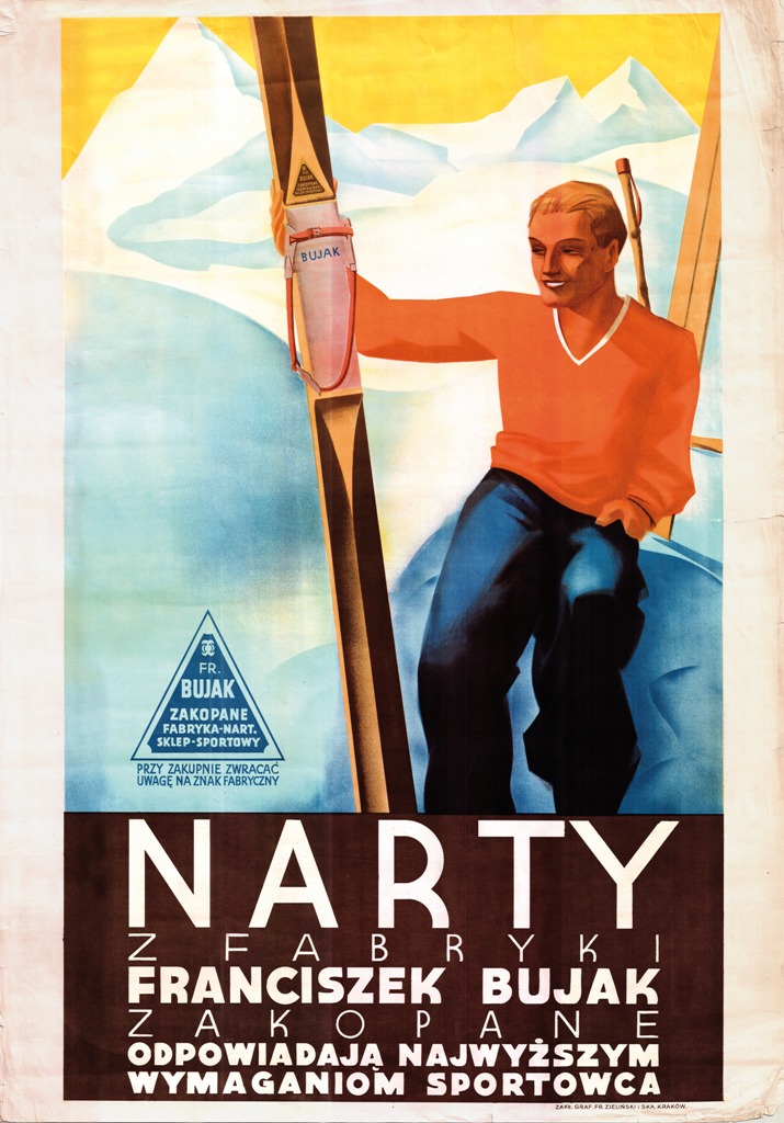 Plakat „Narty z fabryki Franciszek Bujak Zakopane”, ok. 1935 r. Proj. N.N., ze zbiorów Muzeum Tatrzańskiego im. dra Tytusa Chałubińskiego w Zakopanem, plakat prezentowany na wystawie