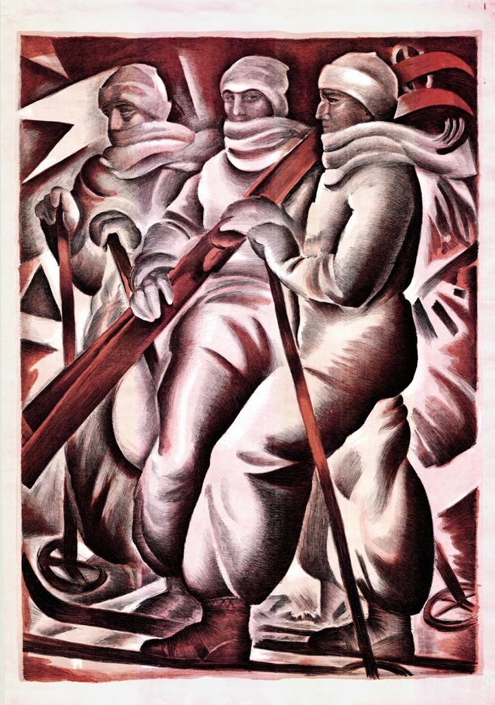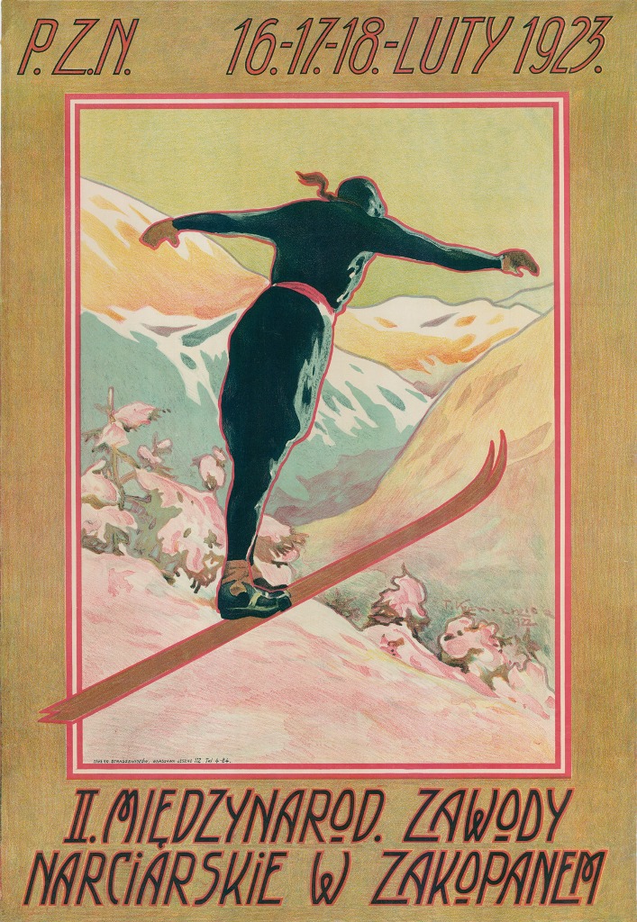 Plakat „II. Międzynarod. Zawody Narciarskie w Zakopanem”, 1923 r. Proj. Tadeusz Koniewicz, ze zbiorów Muzeum Tatrzańskiego im. dra Tytusa Chałubińskiego w Zakopanem, plakat prezentowany na wystawie