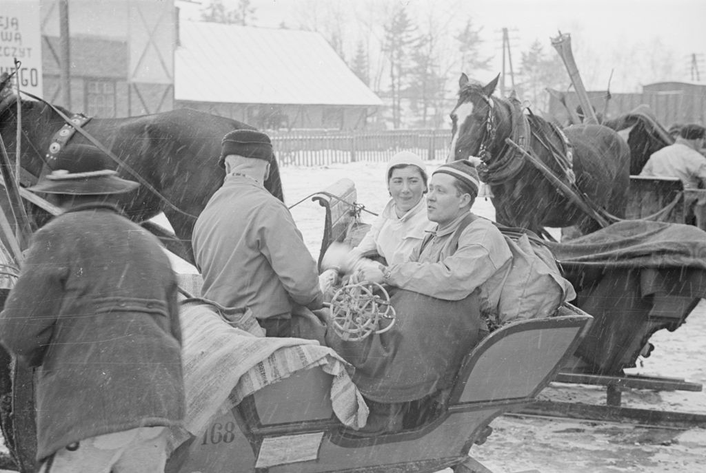 Turyści przejeżdżający saniami do hotelu lub pensjonatu w Zakopanem, lata 30. XX w., ze zbiorów Muzeum Tatrzańskiego im. dra Tytusa Chałubińskiego w Zakopanem, fotografia prezentowana na wystawie